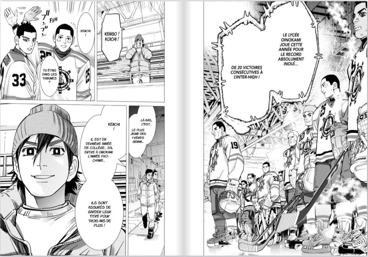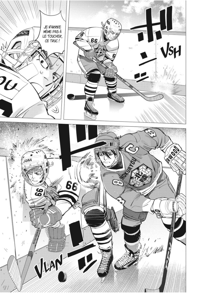 Résumé de l’éditeur : Entrez dans l’aréna et préparez-vous au choc ! Jeune espoir national du patinage artistique, Rou Shirakawa gâche sa carrière quand il est pris d’un accès de violence inexplicable devant les caméras du Japon entier. Il vient pourtant de remporter un tournoi décisif grâce au programme préparé par sa mère et entraîneuse, décédée quelque temps plus tôt dans un accident… La disgrâce s’ajoute au deuil et l’orphelin n’a d’autre choix que de s’installer chez son grand-père à Hokkaido, dans le nord du pays. Dans cette terre de grand froid, le hockey sur glace règne en maître et les membres de l’équipe du lycée local sont des stars. Pour un Rou obsédé par l’élégance, ce sport n’est qu’une lutte barbare… Mais il pourrait aussi être sa dernière chance de rechausser les patins pour atteindre de nouveaux sommets ! Avec son sens inné du spectacle et de l’humour, Satoru Noda ( Golden Kamui) donne tout pour transmettre sa passion pour le hockey sur glace, sport de compétition aussi beau que brutal. Que vous soyez adepte ou non, montée d’adrénaline garantie !