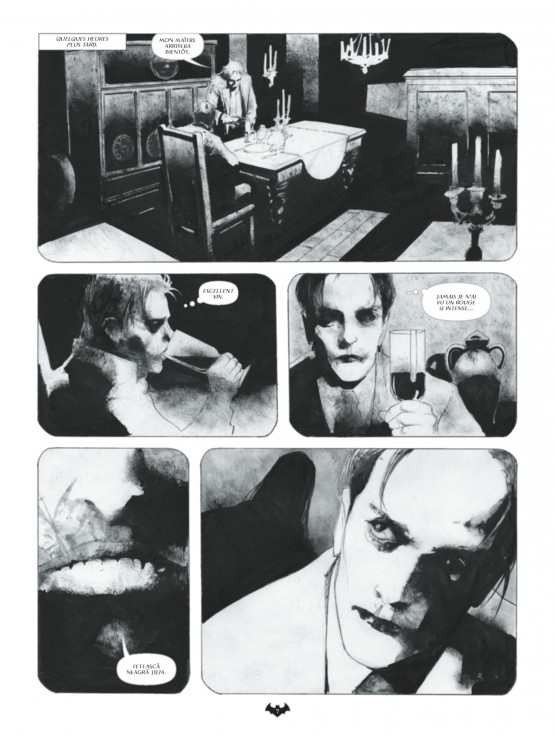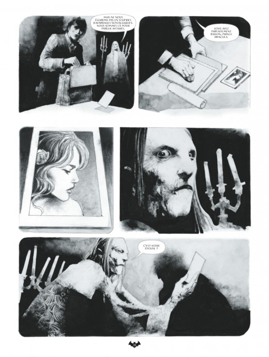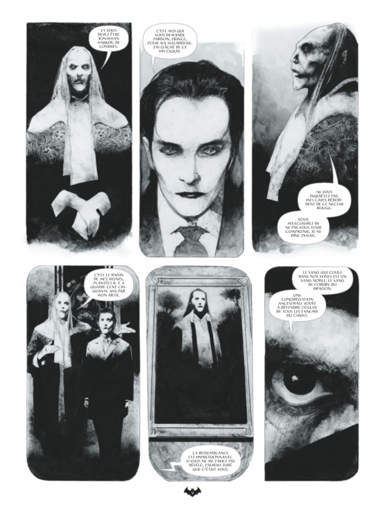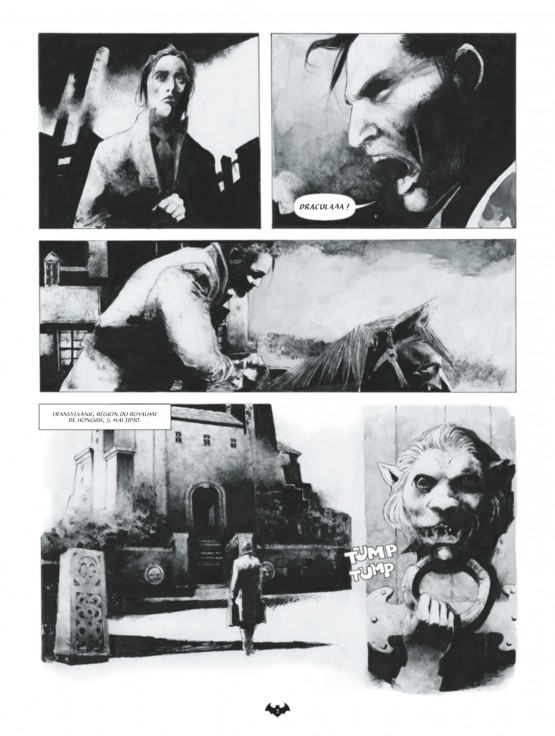 Yeux exorbités, lèvres exsangues, ridés étirées comme des toiles d’araignées, corps dénudés et sanglants parcourent cet album très très noir. Il est en outre doté dans ses dernières pages d’un important appareil critique et iconographique consacré au mythe de Dracula.