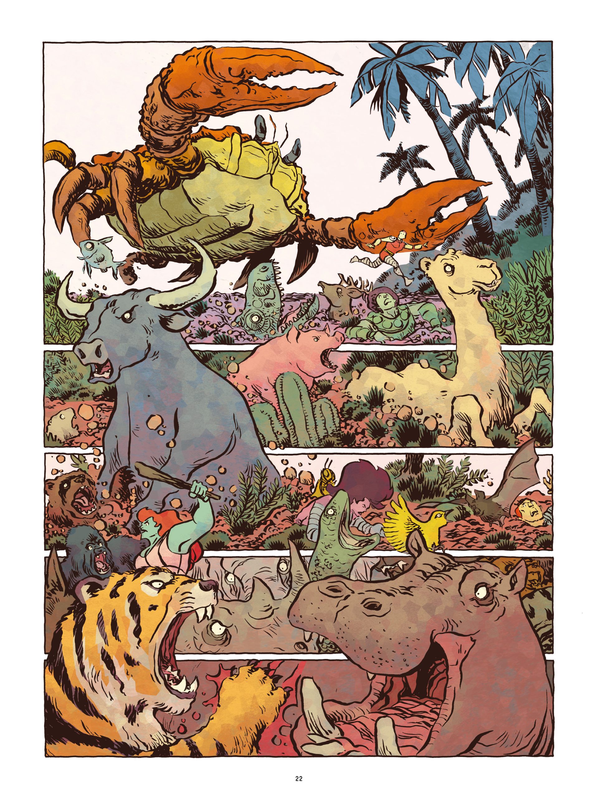 Le premier présenté, sans nom, est le premier être vivant apparu. Il s’élève dans un acte criminel, à la façon d’un Caïn, en tuant son semblable, second-né. Dès sa naissance, cet être veut le pouvoir, veut assurer sa seule domination. C’est un prédateur. Lonergan illustre fort bien cela sans aucun mot, en illustrant en fil rouge sa relation aux femmes, des trophées à obtenir et à souiller.