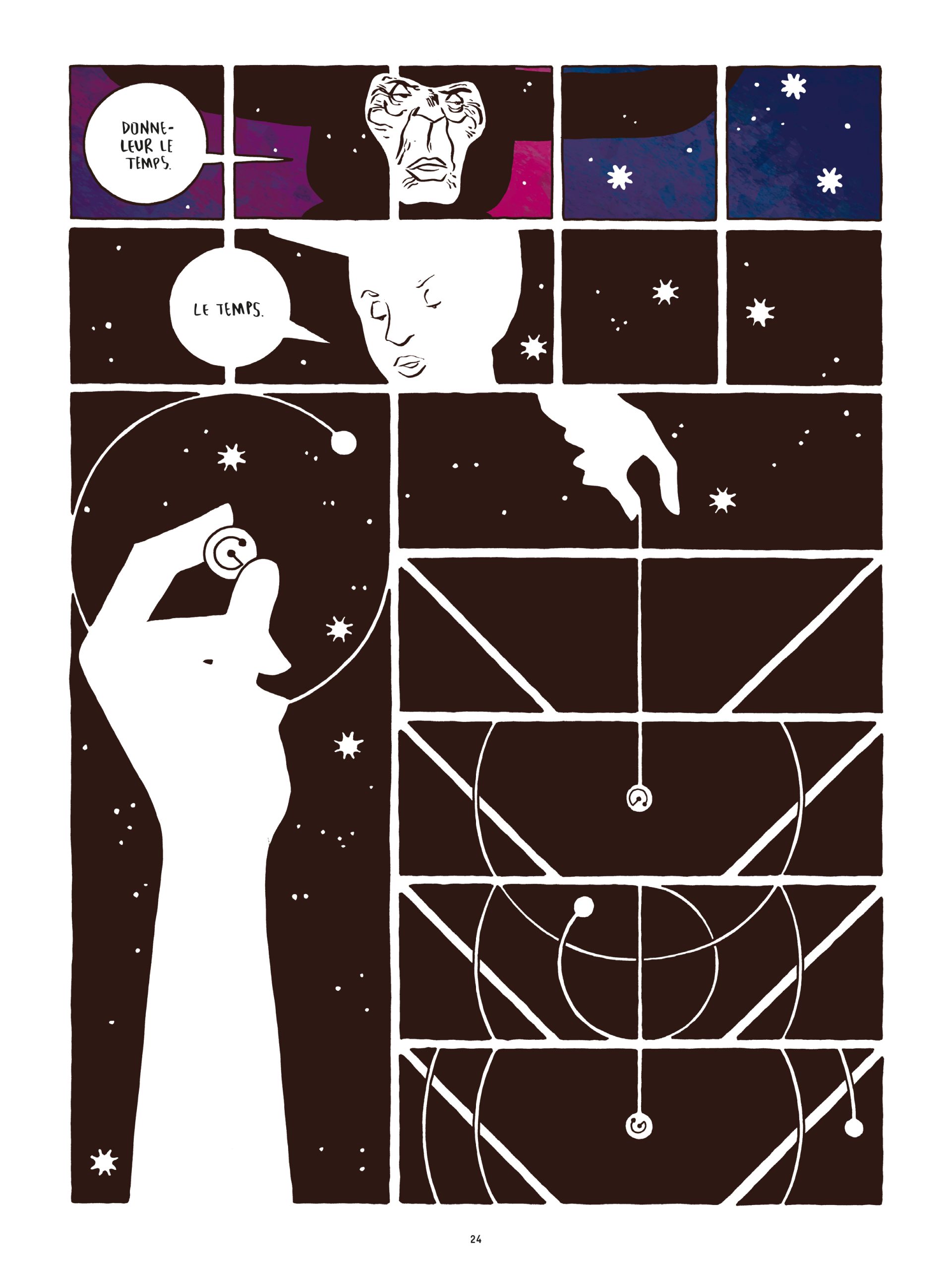 Mais ce n’est pas la seule performance narrative proposée par l’artiste. Sa spécialité, c’est d’utiliser la composition des pages pour guider l’œil du lecteur et cette fois-ci, générer du mouvement. Ses traits de mouvement, blancs entourés de noir, ressemblent comme deux gouttes d’eau à des gouttières, qui viennent couper les cases, mais surtout diriger la lecture. La ligne de déplacement d’une lance, la lanière d’un fouet divin, deviennent des rails qui entraînent le lecteur dans la bonne direction, au milieu du foisonnement des cases.