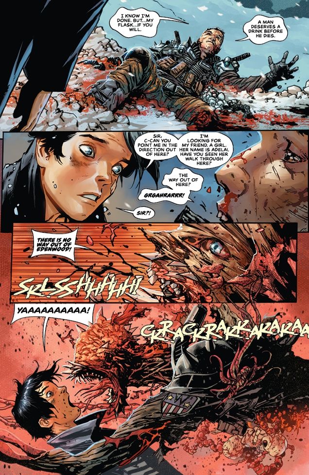 Fidèle à son style vif et dynamique, Tony S. Daniel mène son aventure tambour battant, multipliant les scènes de combats avec beaucoup d’efficacité. Extrêmement à l’aise pour représenter les forces démoniaques, le dessinateur s’en donne à cœur joie. Et imaginant des créatures toujours plus impressionnantes, il enchaine les scènes, ménageant suspense et action trépidante. Merveilleusement secondé par la colorisation de Jay David Ramos puis de Leonardo Paciarotti, il développe une ambiance sombre et horrifique particulièrement enlevée. On connaissait déjà ce talent du dessinateur. Ainsi, les adeptes de son style ne seront pas déçus. Mais dans la mesure où cette fois-ci, il officie aussi au scénario, il ne va pas s’en contenter.