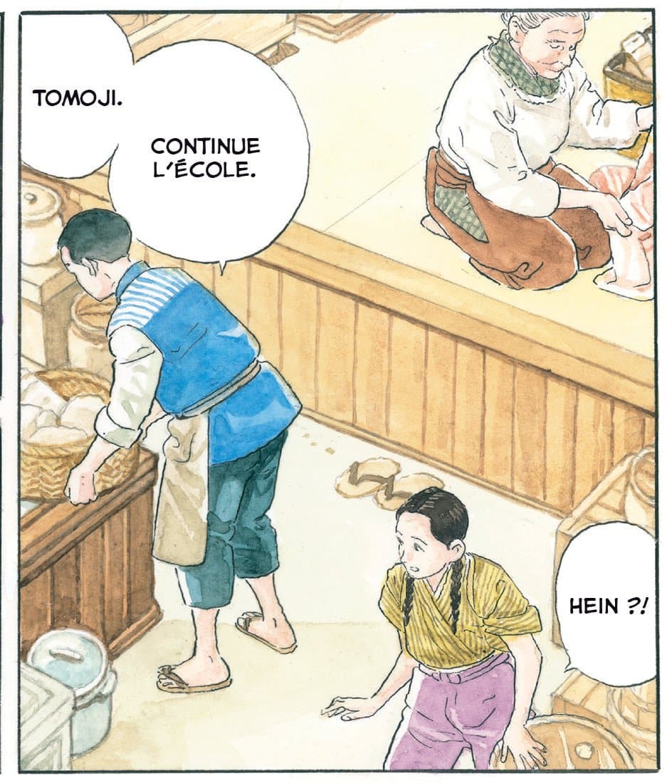 C’est aussi la première fois que le maître mangaka traite de la ruralité, lui qui est un habitué des histoires citadines. Cette admirable fresque du Japon du 20e siècle nous permet de découvrir les campagnes japonaises, contrées les plus éloignées des villes. L’histoire se déroule pendant les ères Meiji (1868-1912), Taishô (1912-1926) et Shôwa (1926-1989). Un Japon très ancré dans les traditions, comme celle concernant les mariages arrangés (ici entre Tomoji et Fumiaki).