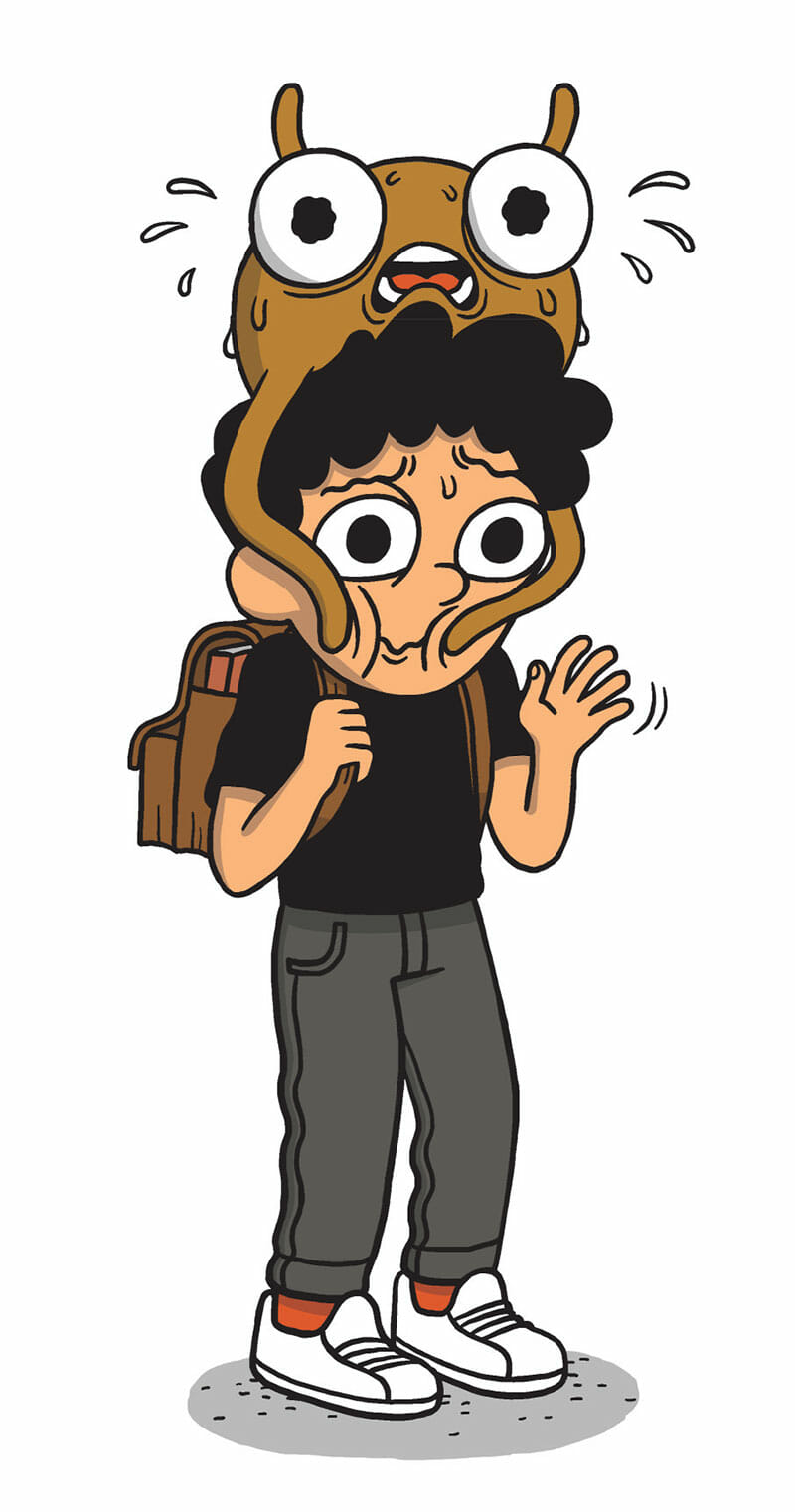 « Je suis une mascotte imaginaire qui représente tes pires angoisses. Ecoute… T’es plus au CE2, là. Tes petits camarades t’ignorent parce que tu as encore une tête de bébe, et puis ils ont sûrement vu que tu avais une étiquette avec ton nom sur ton pull. Et d’ailleurs tu l’as mis à l’envers. Le plus simple, c’est que tu attendes que tous les groupes soient formés. Il restera que les têtes de bébé mal habillées. Ensemble, vous formerez le groupe des « sans amis » mais au moins, tu seras plus tout seul. Bienvenue dans le monde merveilleux de l’adolescence. »