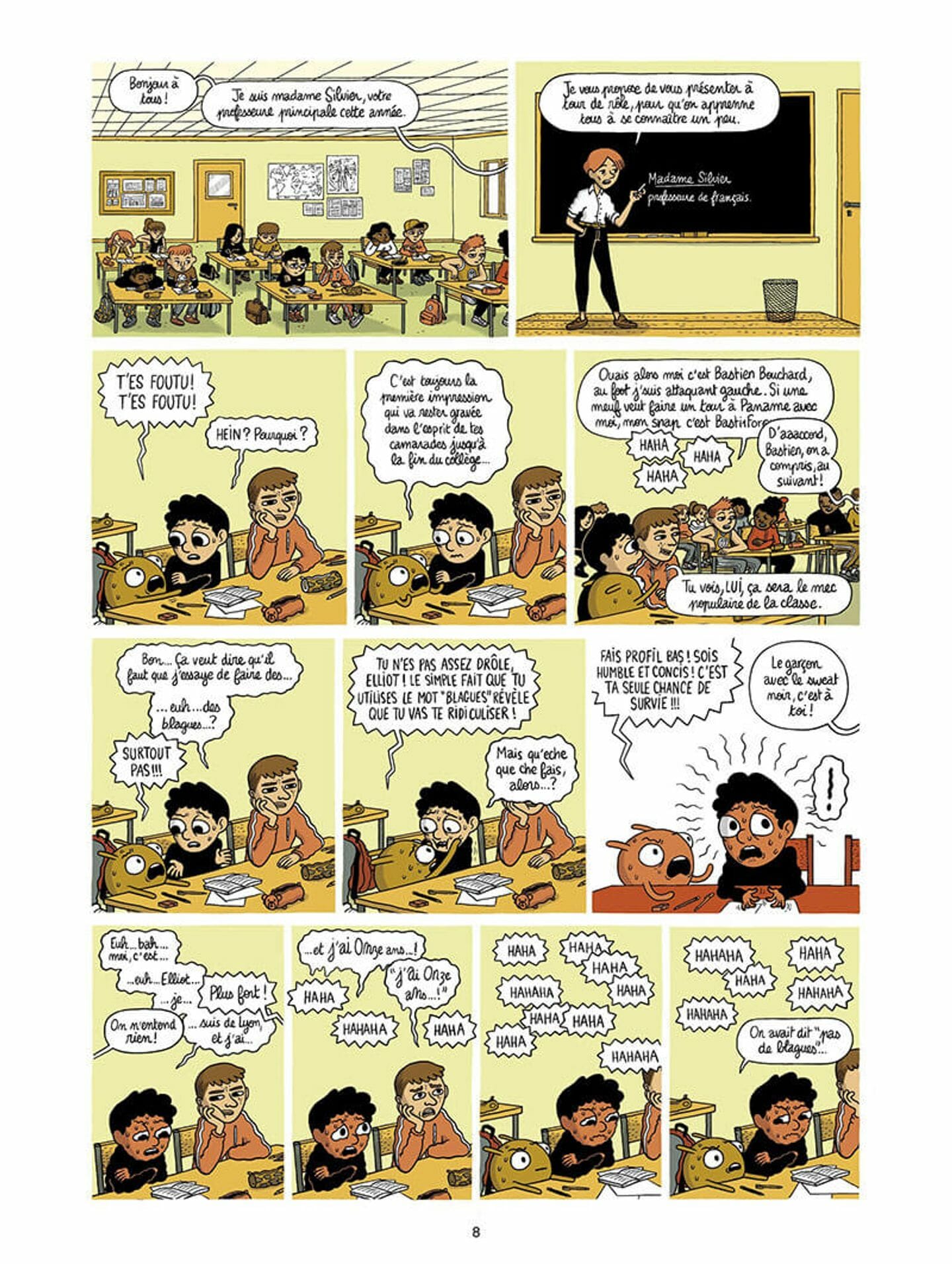 Prépublié dans le journal Spirou, Elliot au collège est un album important. Il permet aux plus jeunes d’aborder ce thème d’une manière humoristique. S’il n’y avait que le côté comédie, ce premier opus ne fonctionnerait pas. Théo Grosjean est d’une grande justesse dans son récit et c’est ce qui en fait une très bonne série. Si elle n’est pas autobiographique, l’auteur a pioché dans ses souvenirs pour modeler Elliot. Il n’a pas eu d’angoisses comme lui mais ils se ressemblent néanmoins en ce qui concerne leur envie d’être invisible aux autres pour ne pas se faire remarquer.