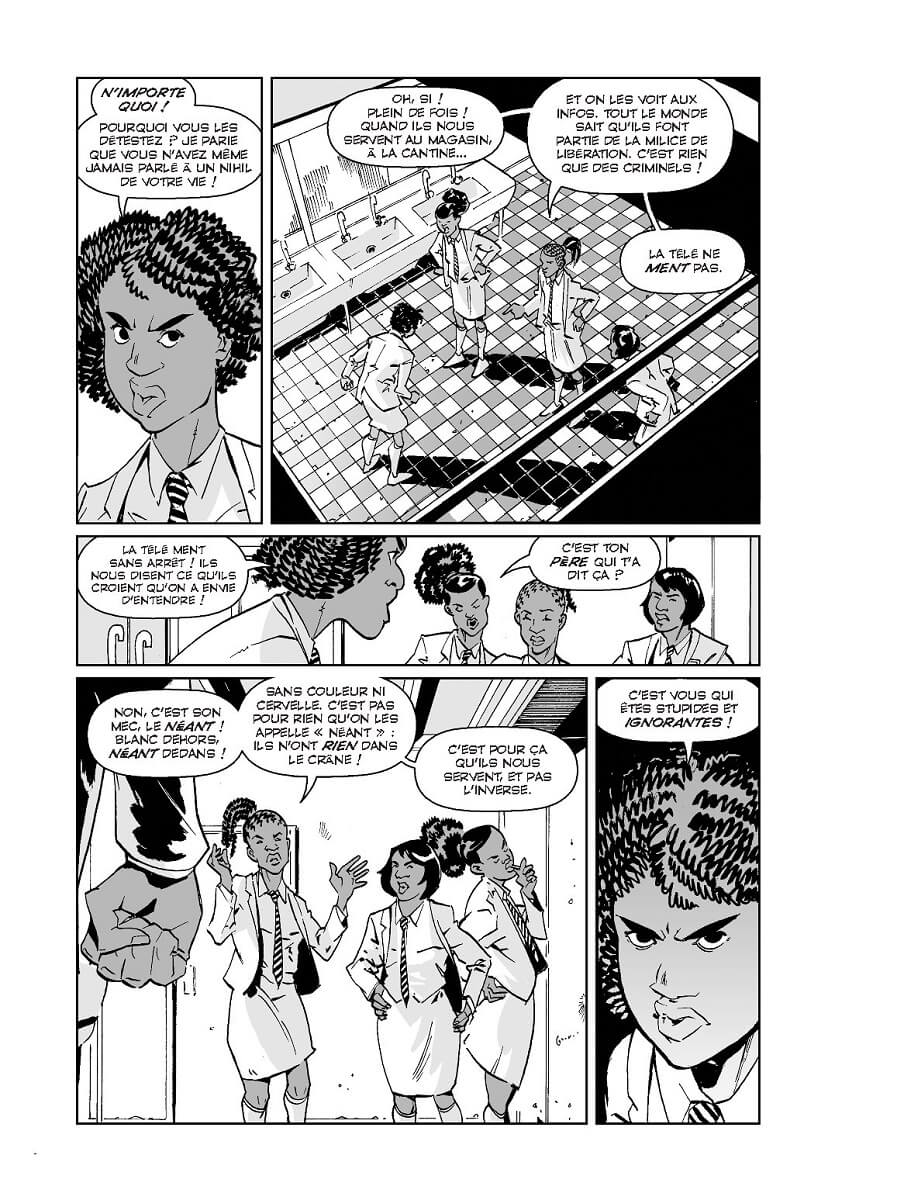 L’histoire de Ian Edginton étonne par son côté très moderne du propos, dont les thématiques résonnent actuellement. Il met en scène une société ségrégationniste inversée où les noirs, peu nombreux, dominent outrageusement les blancs, fondée sur le modèle d’apartheid de l’Afrique du Sud.