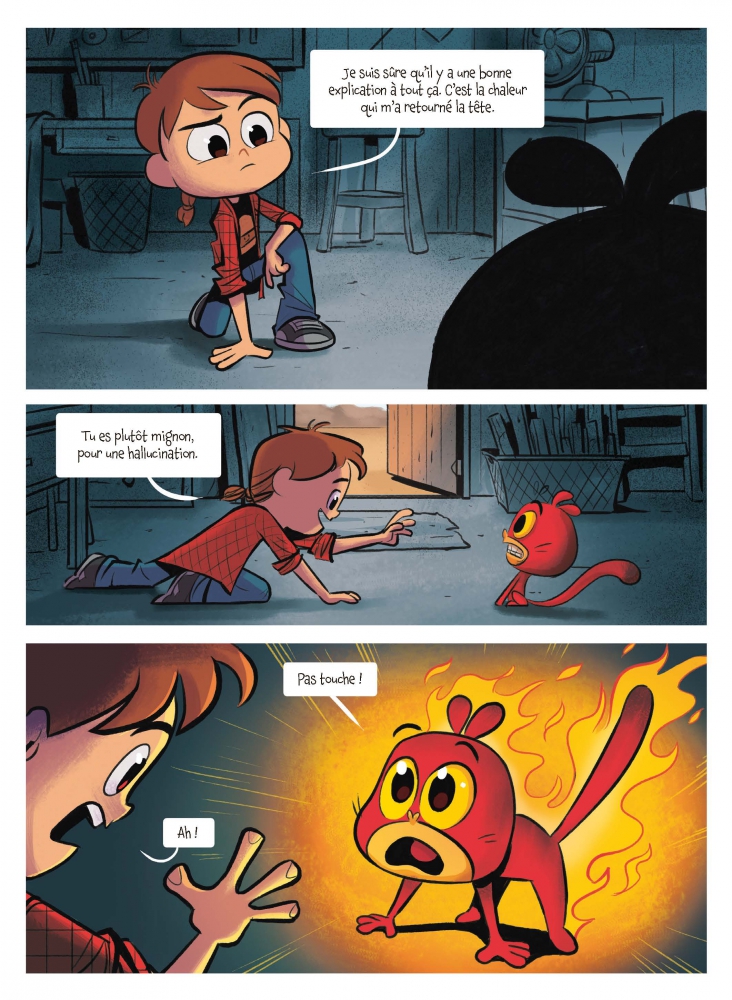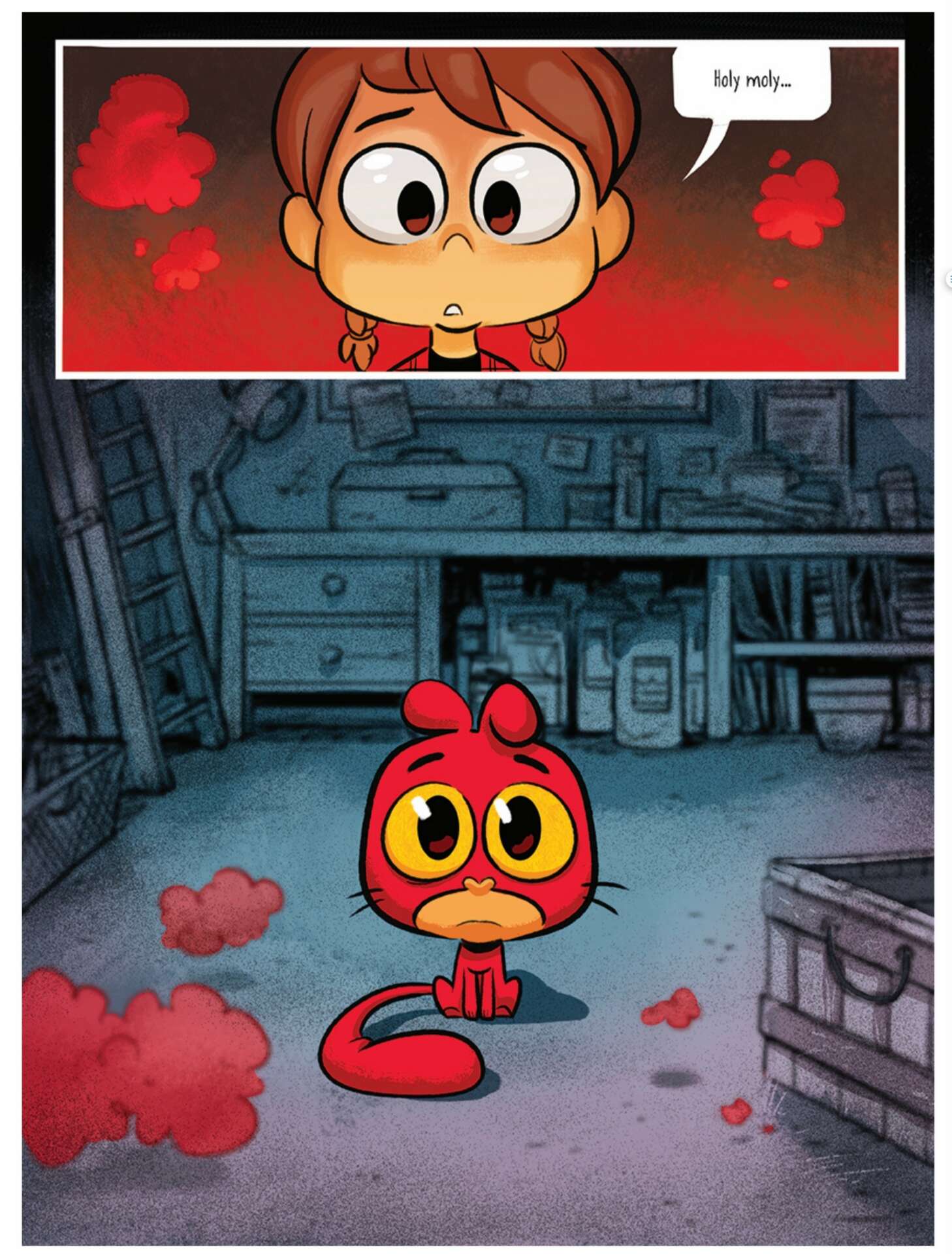 Et dans un grand fracas fait apparaître une mystérieuse créature. Mi-chat, mi-singe, elle est rouge avec de grands yeux jaunes !
