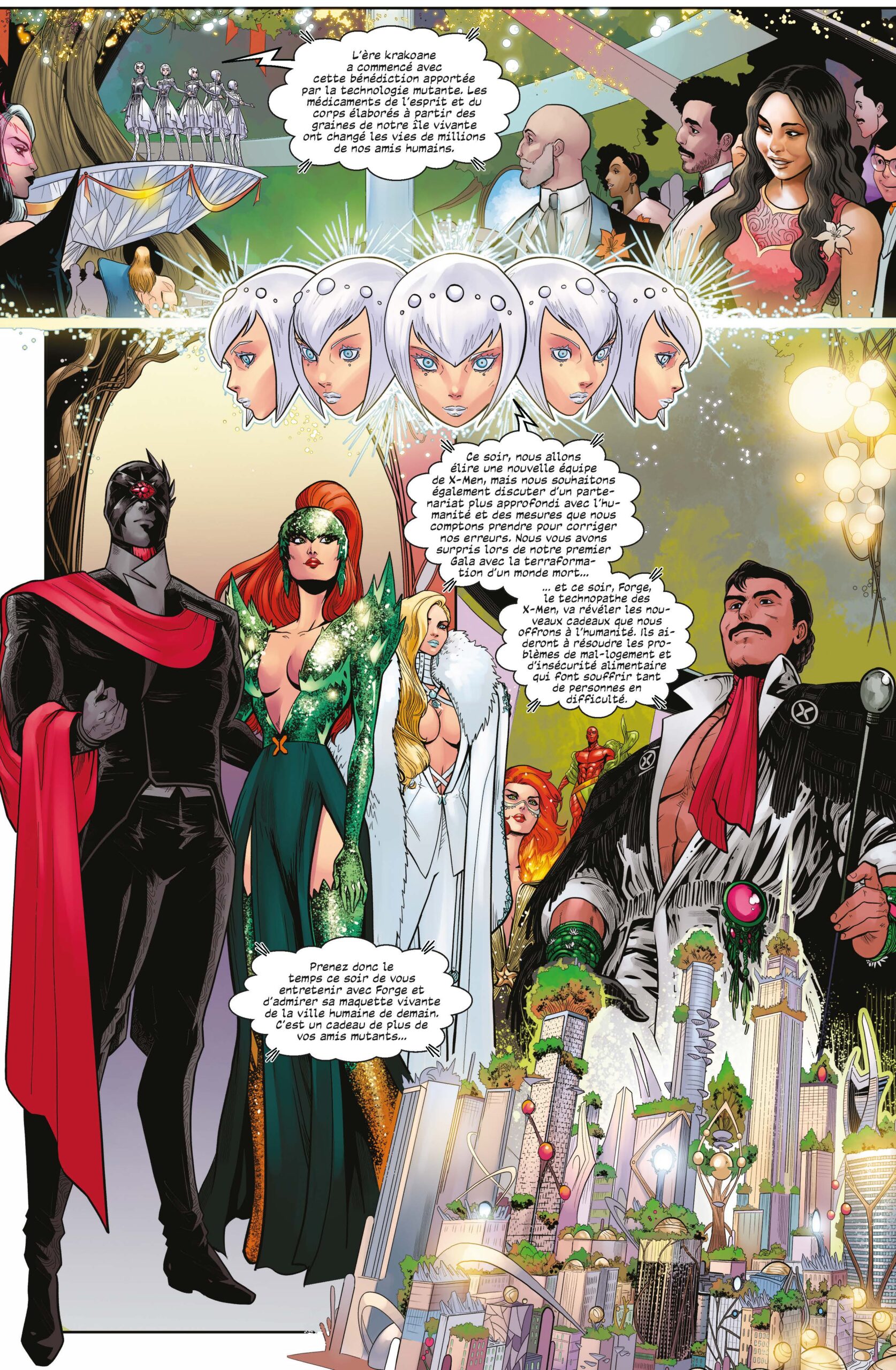 Résumé éditeur : Le Gala des Damnés est l’occasion pour les mutants d’asseoir leur influence sur le monde et le cosmos, mais cette année, il signera leur perte ! Orchis et le Docteur Stasis ont planifié une attaque d’ampleur contre le Professeur Xavier, les X-Men et les autres habitants de Krakoa, et cet assaut va engendrer une des périodes les plus sombres pour l’homo superior. Si elle commence par une résurrection, elle s’achèvera en revanche avec des morts. Beaucoup de morts. Cette nouvelle ère s’ouvre avec un gigantesque épisode de 75 pages, une nouvelle série (Dark X-Men) et un nouveau statu quo pour les séries X-Men et Immortal X-Men. On n’ose en dire plus, mais croyez-nous, rarement un album consacré aux mutants a été aussi riche en rebondissements !