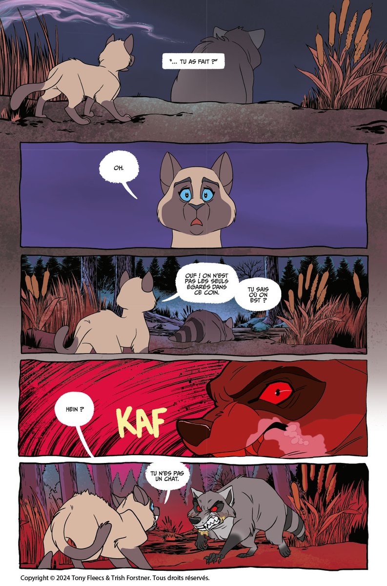 Résumé de l’éditeur : Découvrez Elsie, Lord Fluffy Britches et Patch, trois chats d’intérieur perdus dans un environnement hostile en pleine épidémie de rage. Sans leurs humains pour les protéger, ils doivent traverser une forêt infestée de bêtes enragées pour retrouver leur foyer. Suivez bien ces conseils, petits chats : ne vous faites pas mordre, ne vous faites pas griffer, ne devenez pas féroces… Après le récit complet Stray Dogs, Tony Fleecs retrouve Trish Forstner et Tone Rodriguez pour un nouveau mélange entre l’univers mignon des animaux façon dessins animés des années 90 et l’atmosphère d’un film d’horreur. Cette fois, ce sont les chats qui sont à l’honneur, et le récit s’étend sur une forme longue. En plus de la couverture régulière, Panini Comics proposera deux couvertures alternatives rendant hommage à des films d’horreur récents mais ayant déjà l’aura de films cultes : The Witch de Robert Eggers (Nosferatu) et Barbare de Zach Cregger (Évanouis). La série, toujours en cours aux États-Unis, débute ici avec les dix premiers épisodes.
