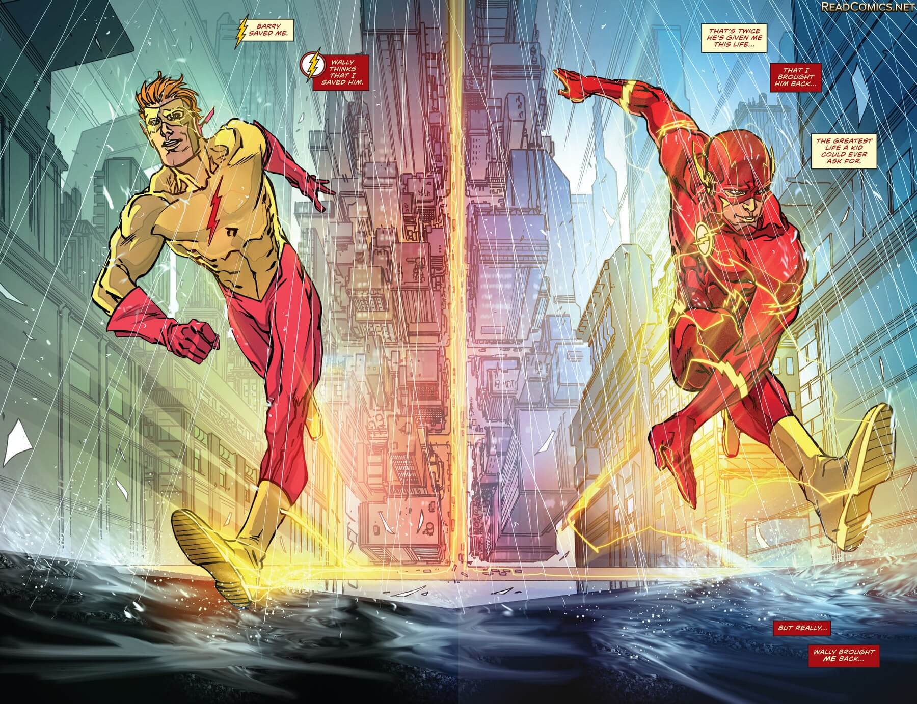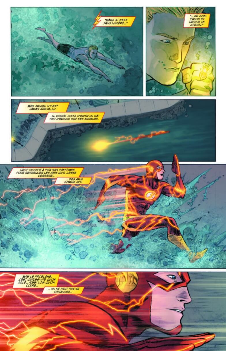 Alors que Flash parcourt la ville en quête d’âmes à sauver, d’étranges visions lui parviennent. Passé ou futur, hallucinations ou réalités, Barry se questionne énormément sur ce qui lui arrive. Jusqu’à ce que Kid Flash, Wally West apparaisse devant lui ! Attention, chez DC Comics il y a eu 2 Wally West. Cela va se compliquer un peu, mais il y a quelques années eut lieu un événement majeur, le Flashpoint. En fait, Barry a tenté de remonter le temps pour sauver sa mère, ce qui a changé le cours des choses. Et notamment des personnages qui ont disparus, d’autres qui ont connus des destins différents… Sans trop rentrer dans le détail, Flash s’en est énormément voulu, et à par la suite rétabli le cours de l’histoire en laissant le destin de sa mère s’accomplir. Mais même avec cela, beaucoup de choses ont changées… C’est donc le tout premier Wally West, fondateur des Teen Titans qui est revenu, cohabitant avec le second Wally West qui ignore sa présence.
