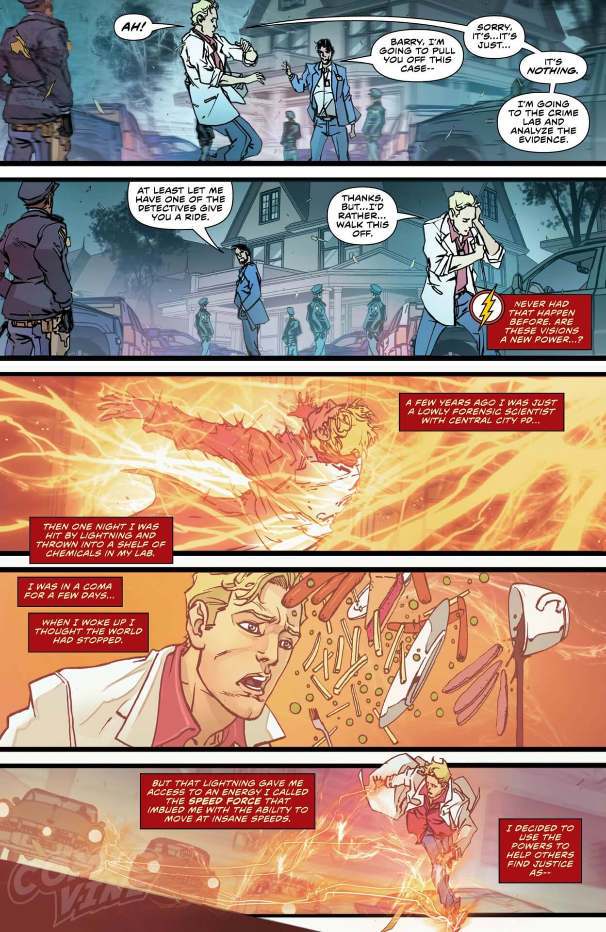 Flash est en réalité Barry Allen (Spoil!). Barry a connu une triste enfance, celle de voir sa mère mourir et son père emprisonné pour ce meurtre qu’il n’a pas commis. Barry décide très jeune de devenir technicien de la police scientifique pour éviter à quiconque de revivre cette injustice, et faire libérer son père. Un jour de travail classique, Barry se fait foudroyer près d’une armoire de produits chimiques dans son laboratoire ce qui le rend inconscient, mais lui procure également ses pouvoirs de vitesse. Pouvoirs qui sont liés à la « Force Véloce », une énergie mystérieuse. C’est cette même « Force Véloce » qui est à l’origine de cette histoire…