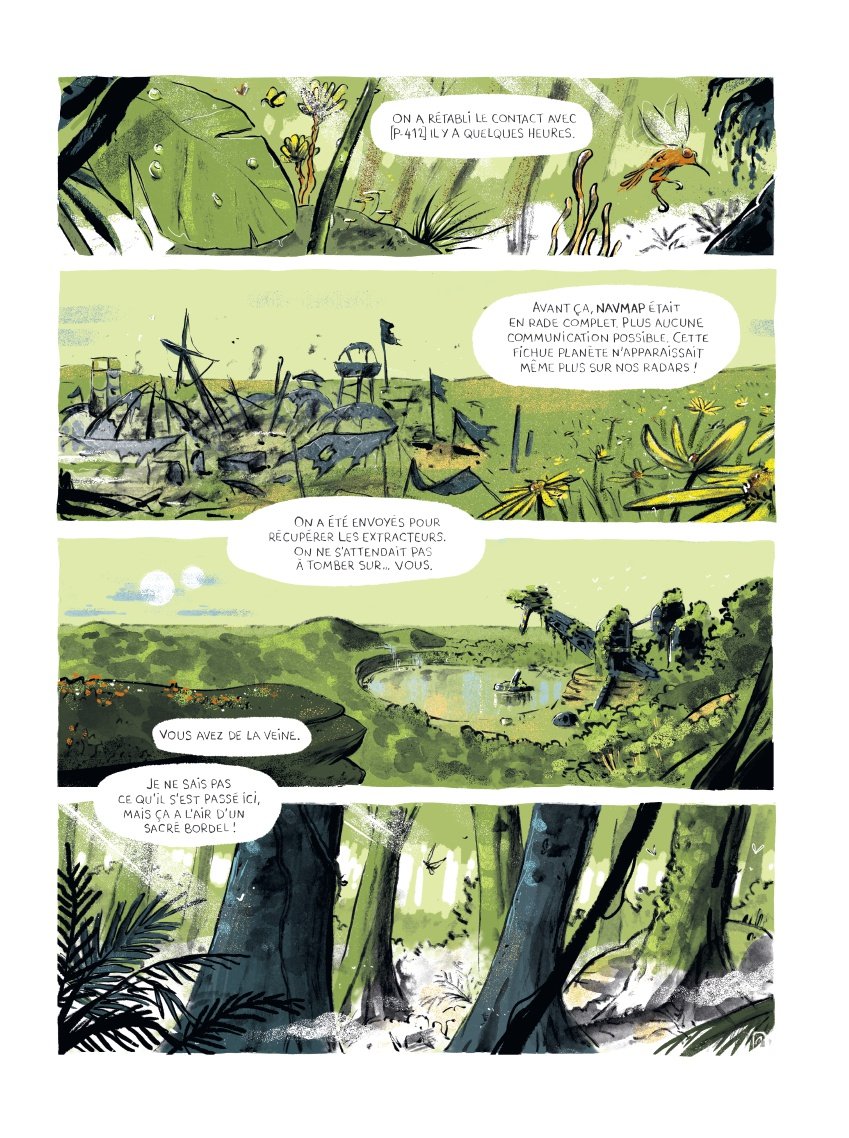 Au-delà des questionnements sur notre rapport à la nature et à sa préservation, Flux nous embarque aussi dans un voyage à travers [P-412]. À l’image de l’adage bien connu (Qu’importe la destination, ce qui compte c’est le chemin parcouru), Flux nous fait traverser les chemins de cette planète. Tildä va y faire de nouvelles rencontres. Elle va aussi se questionner sur ses liens avec sa grand-mère et l’héritage qu’elle lui a laissé. Cela se manifeste aussi graphiquement. En plus de l’ouvrage en couleurs et aux dominantes de jaune et de vert, Jop nous propose quelques planches au dessin plus épuré, plus en noir et blanc. Ces pages évoquent le passé, l’image fondatrice de la grand-mère de Tildä et de son rapport à la nature et à son jardin.