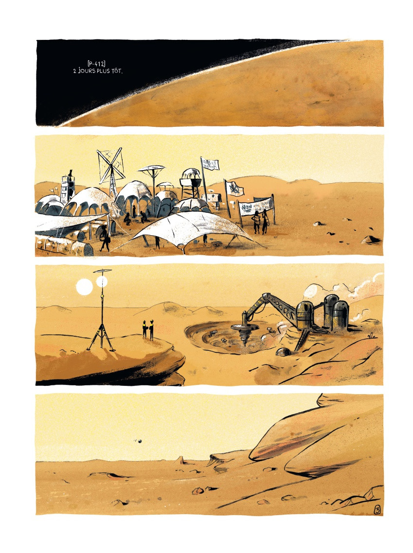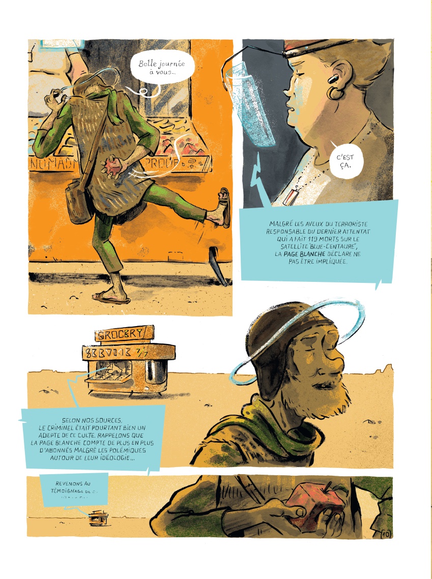 En déplaçant le propos sur une autre planète, Jop évoque tout de même des thèmes qui touchent à l’universel tout en leur donnant le recul nécessaire pour nous questionner à travers ses pages. Qu’est-ce qui déclenche la pluie ? Est-ce une forme de ras-le-bol face à la surexploitation ? Une réponse aux manifestations de l’ordre de la Page Blanche, groupe religieux cherchant à refaire corps avec la nature ? Cette Page Blanche est d’ailleurs tout aussi évocatrice. Elle nous renvoie au renouveau, à l’émancipation de l’humain face aux industriels cherchant à exploiter les sols…