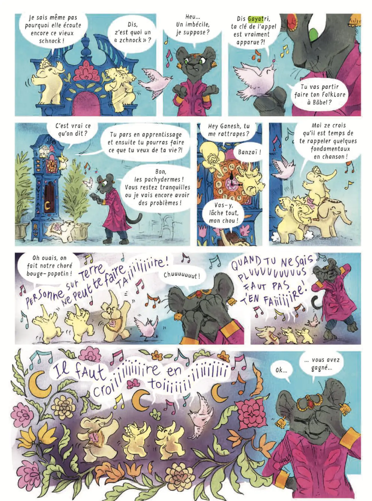 C’est en revanche une première pour Maud Begon dans les univers du scénariste. L’autrice de Bouche d’ombre et Jardin secret déploie son talent dans des planches d’une grande lisibilité. Ses personnages animaliers, au premier chef Gayatari et son père, lorgnent du côté de la série animée Le tour du monde en 80 jours de Claudio Biern Boyd et diffusée sur Antenne 2 dès 1984.
