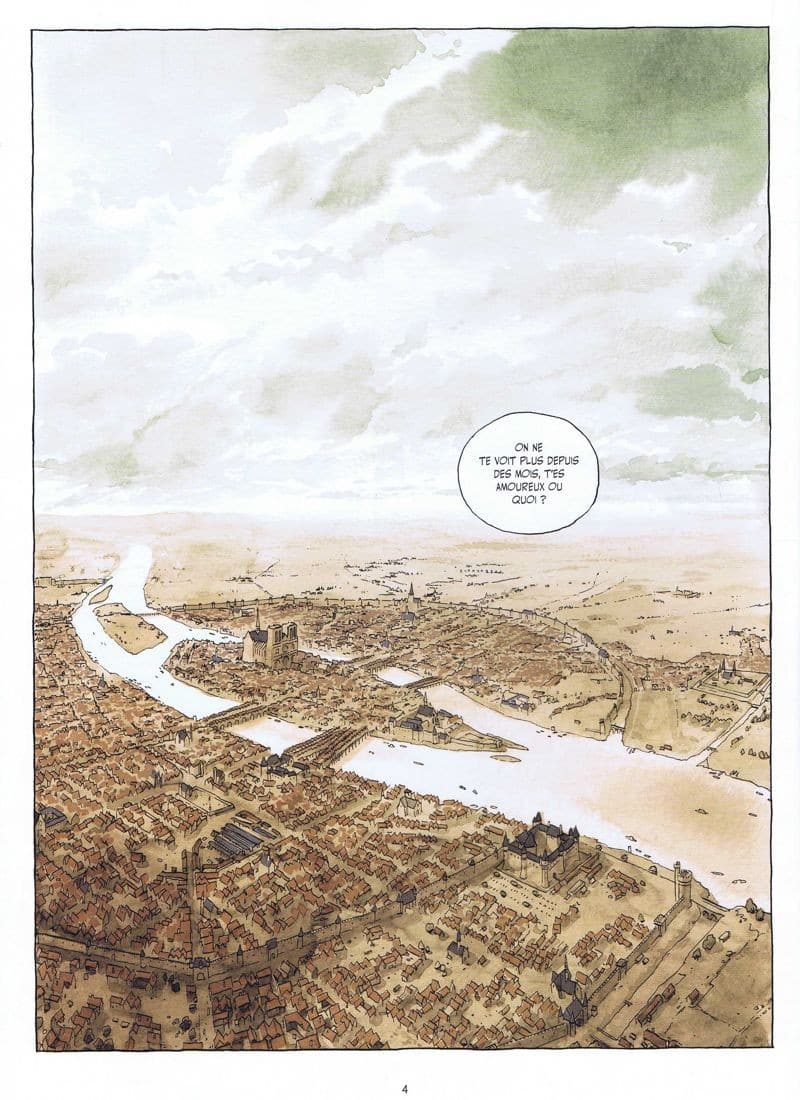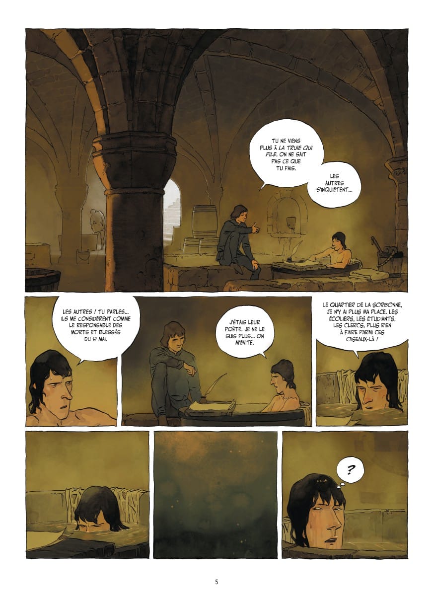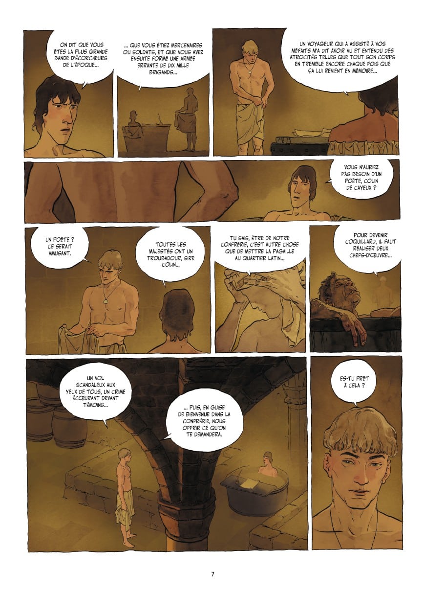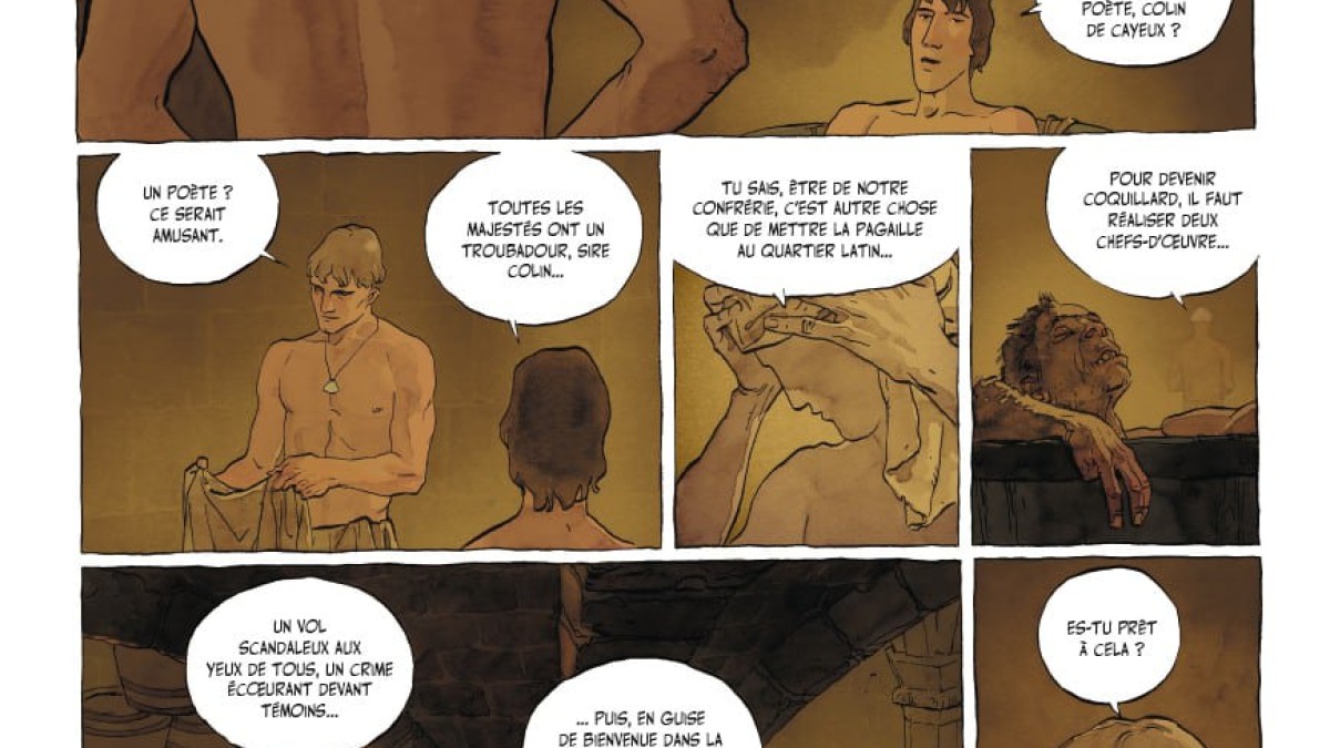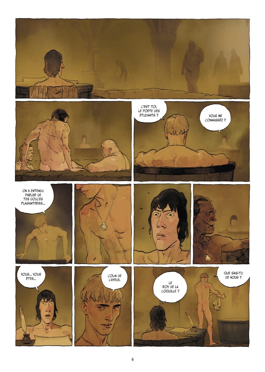 On avait quitté François Villon dans sa prime jeunesse, étudiant rebelle et jeune poète. On le retrouve ici, sous le crayon de Luigi Critone, rescapé du massacre du 9 mai 1453 ( voir tome 1) Après moultes fêtes et ripailles du côté du quartier de la Sorbonne, le jeune Villon vit en reclus. On le retrouve au début de ce deuxième volume,, dans un é étuve où il est venu prendre son bain. C’est là que l’aborde un certain Colin de Cayeux, chef des Coquillards, une bande d’écorcheurs, de brigands pervers et sanguinaires qui a établi ses quartiers à Paris.