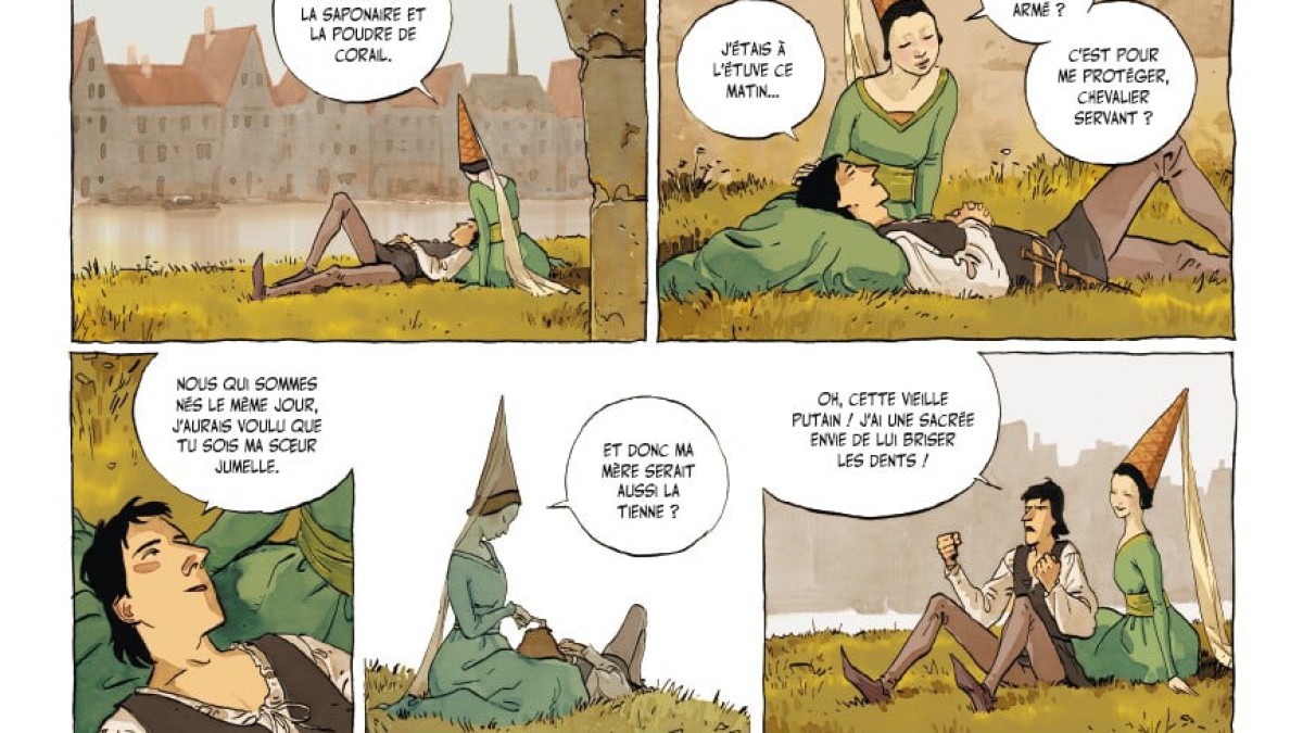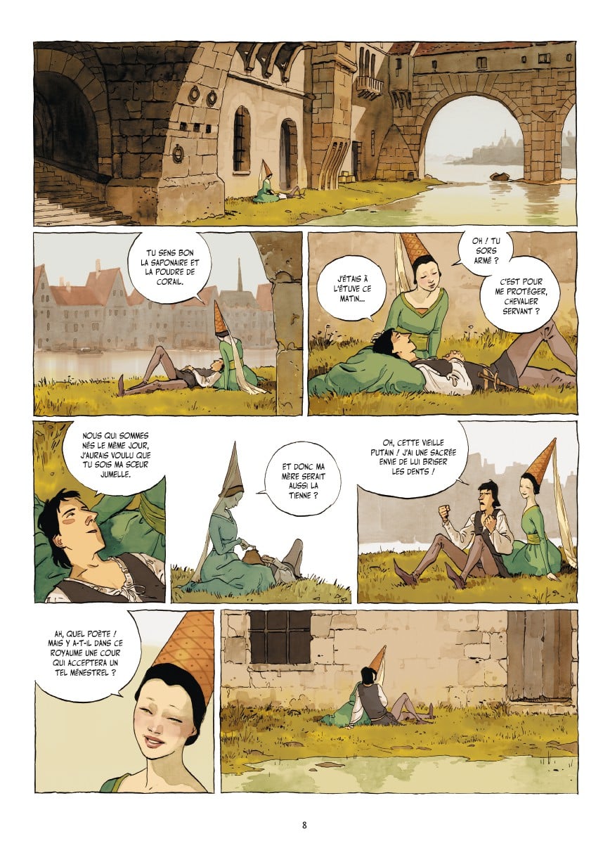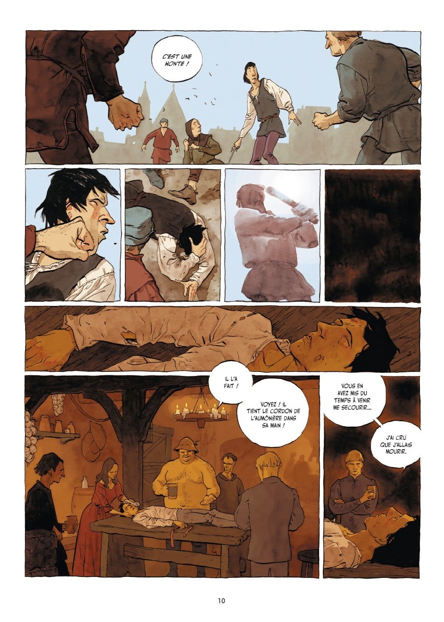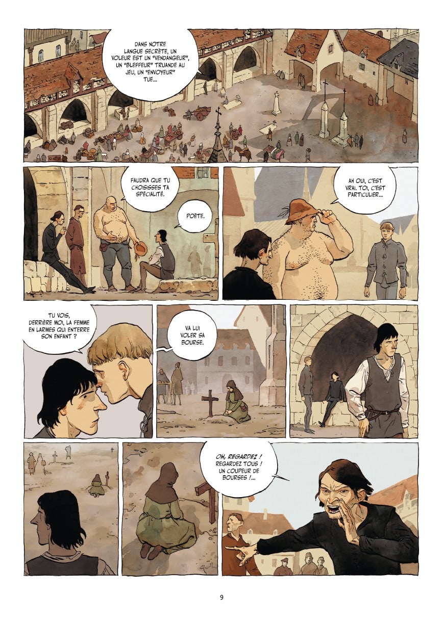 Villon veut en être mais pour faire partie de cette « bande » il faut réaliser « deux chefs-d’oeuvre » un peu particuliers: « un vol sacndaleux aux yeux de tous, un crime écoeurant devant témoins puis faire un don à la confrérie… » Le titre de ce volume, « Bienvenue parmi les ignobles » trouve ici tout son sens. Pour être Coquillard, Villon va se faire voleur et meurtrier. Il vole d’abord une femme qui vient de perdre son enfant puis égorge une prostituée avant de livrer sa femme au chef de la bande…