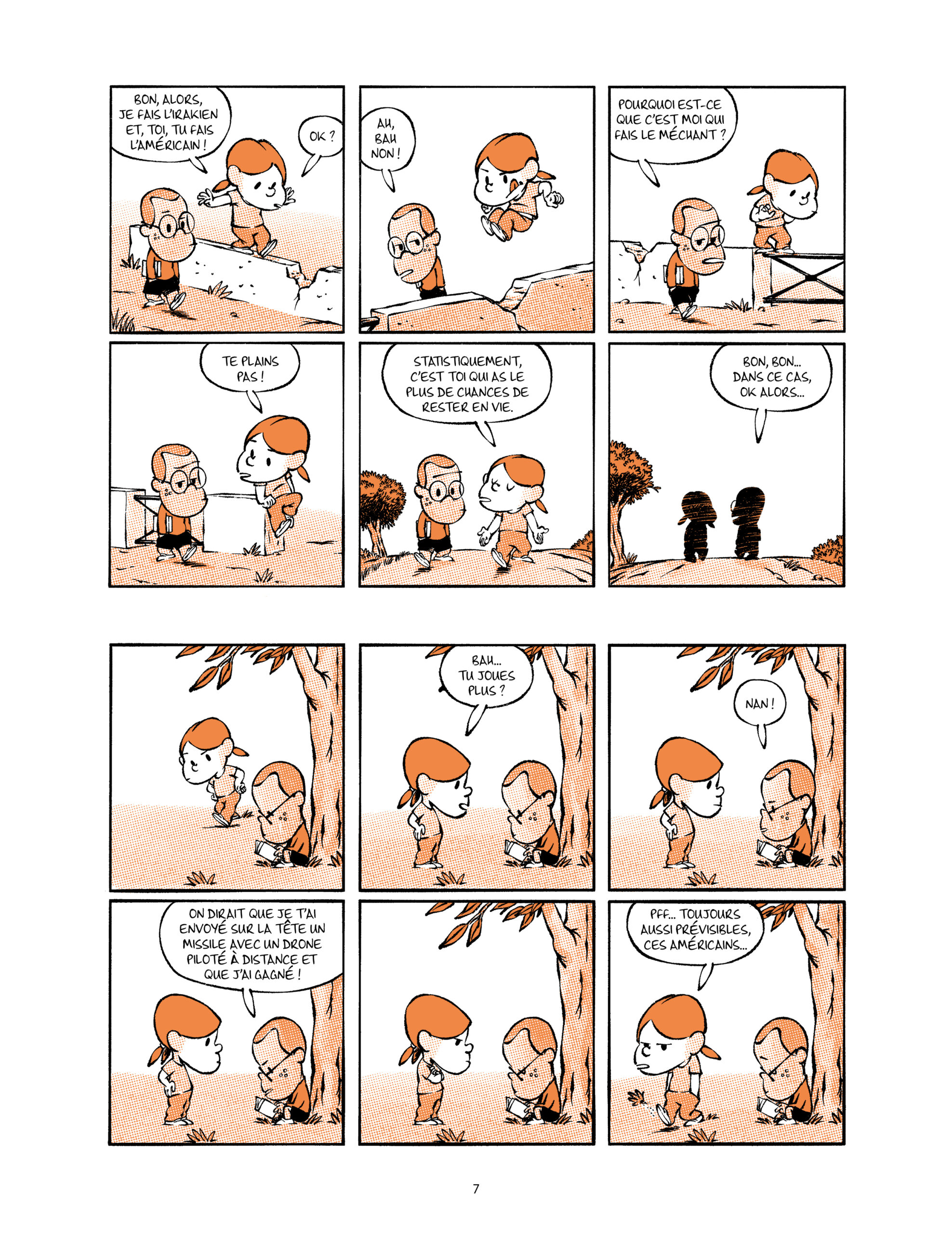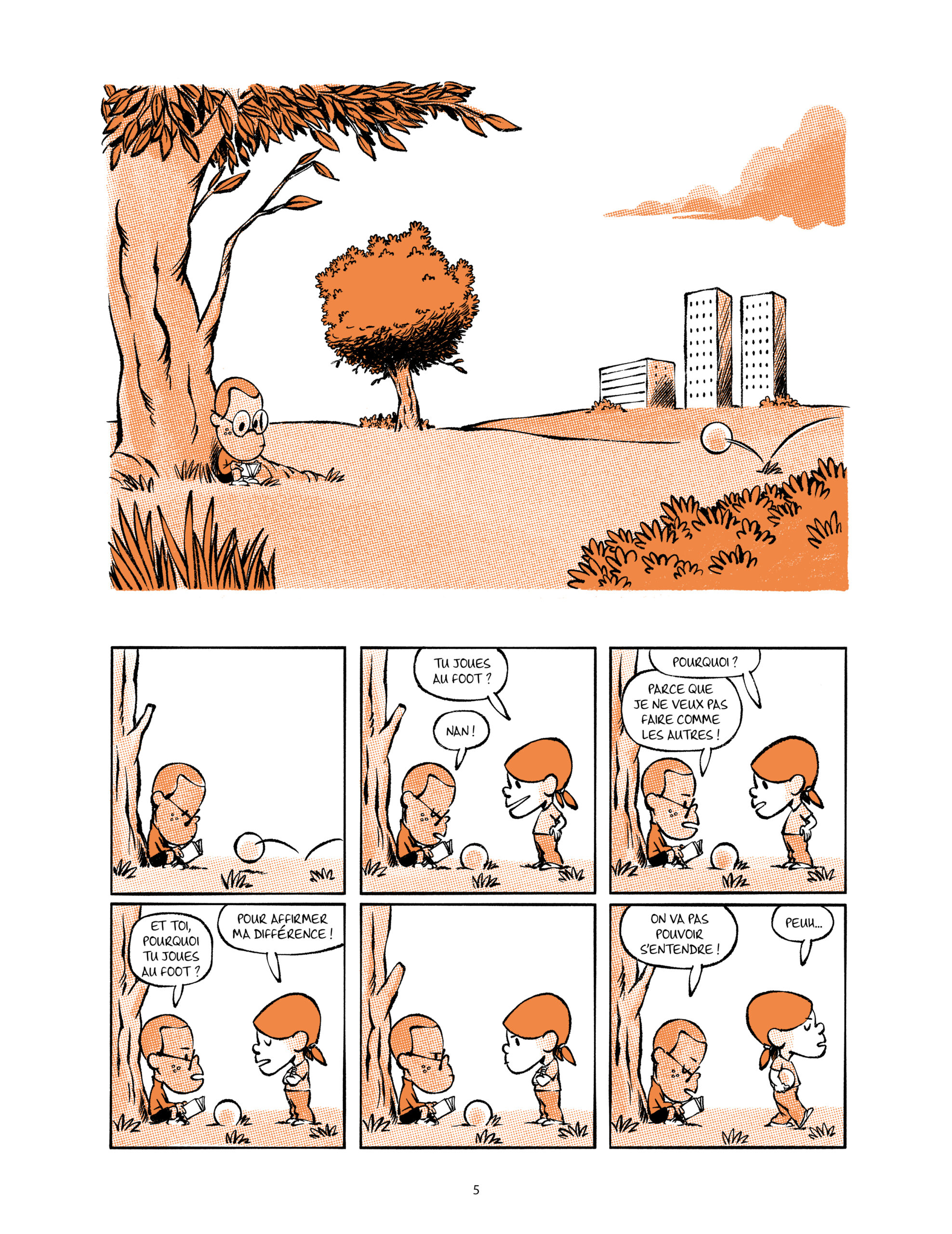 C’est sans doute par la colorimétrie que la solution est venue : noir, blanc, et orange, avec un effet de trames. Ce faisant, l’artiste s’est encore plus coulé dans l’imaginaire du comic-strip. Ses personnages évoluent dans un univers qui aurait pu être celui d’un journal du début du XXe siècle. Et du côté du trait, c’est dans la simplicité et la caricature que James a puisé. Ses personnages en deviennent très expressifs, mais surtout universels. En faisant fi du réalisme, l’artiste incite chaque lecteur et lectrice de placer ses propres images. Il nous invite à nous connecter aux personnages et d’y mettre un peu de nous à l’intérieur. Ce qui est idéal pour permettre aux lecteurs d’adhérer émotionnellement à leur lecture.