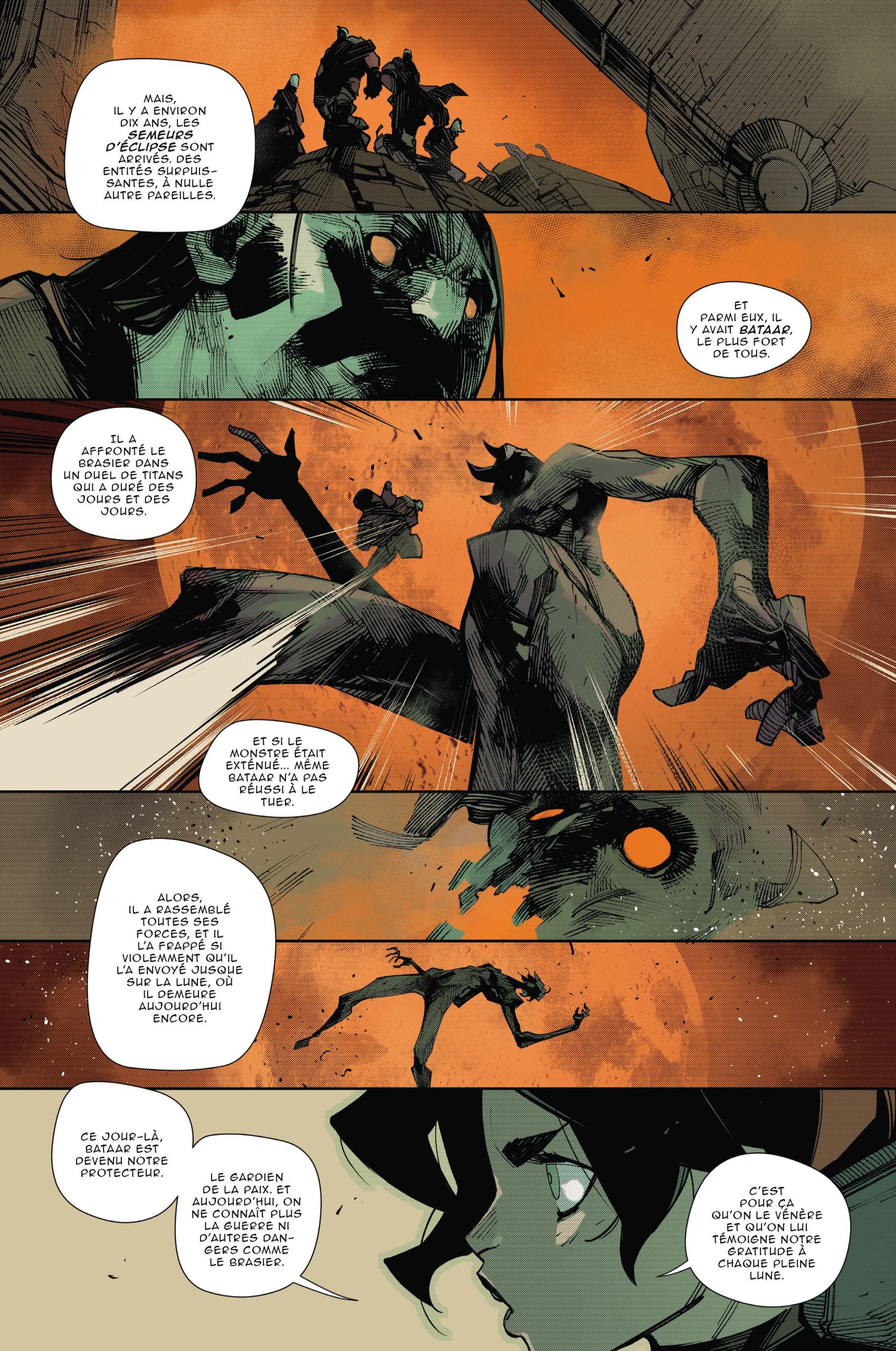 Un monde dévasté, une société nouvelle. Depuis que le puissant Bataar a vaincu le grand brasier et l’a exilé sur la lune, il a fallu reconstruire le monde des humains. Un système à la gloire de Bataar a été instauré, entre politique et religion. Et depuis lors, tout fonctionne, globalement. Mais un témoin du passé fait son apparition et menace de faire chuter le régime en dévoilant la réalité de ces événements. Dommage pour Loloï, cuisinière itinérante, qui a retrouvé ce témoin gênant mais manifestement très puissant.