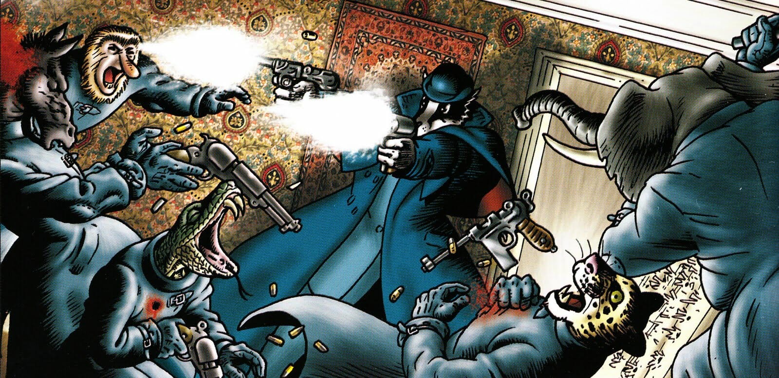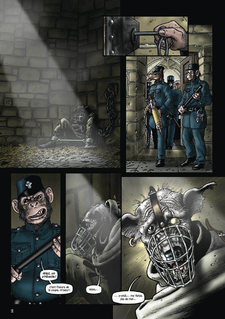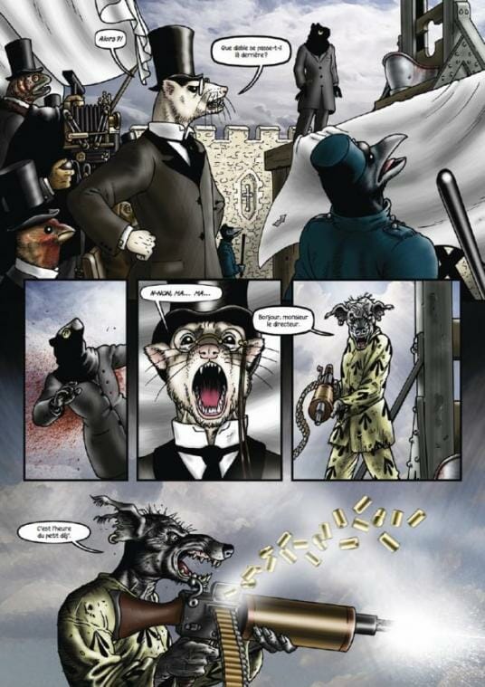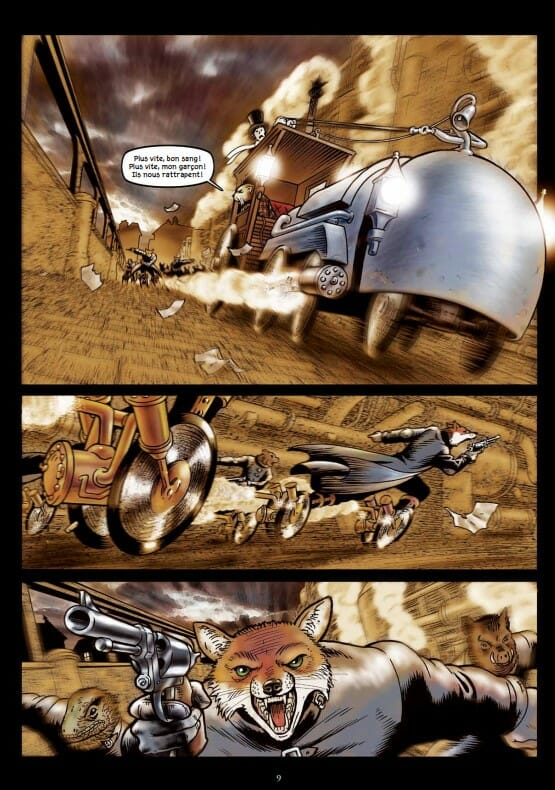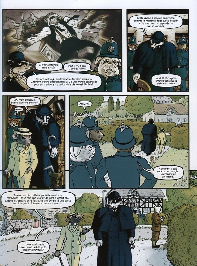 Quant au dessin, il fera penser à Blacksad ou encore Mouse Guard de David Petersen, des références pour Grandville. Mais il remercie également Jean Ignace Isidore Gérard, illustrateur français connu sous le nom de J.J. Grandville et adepte du zoomorphisme. Car les animaux de Grandville sont anthropomorphes. Et ce genre est magnifique sous les pinceaux de Bryan Talbot. S’il utilise une méthode traditionnelle pour dessiner et encrer, il rehausse ses couleurs grâce à Photoshop, d’où ce très beau mélange.