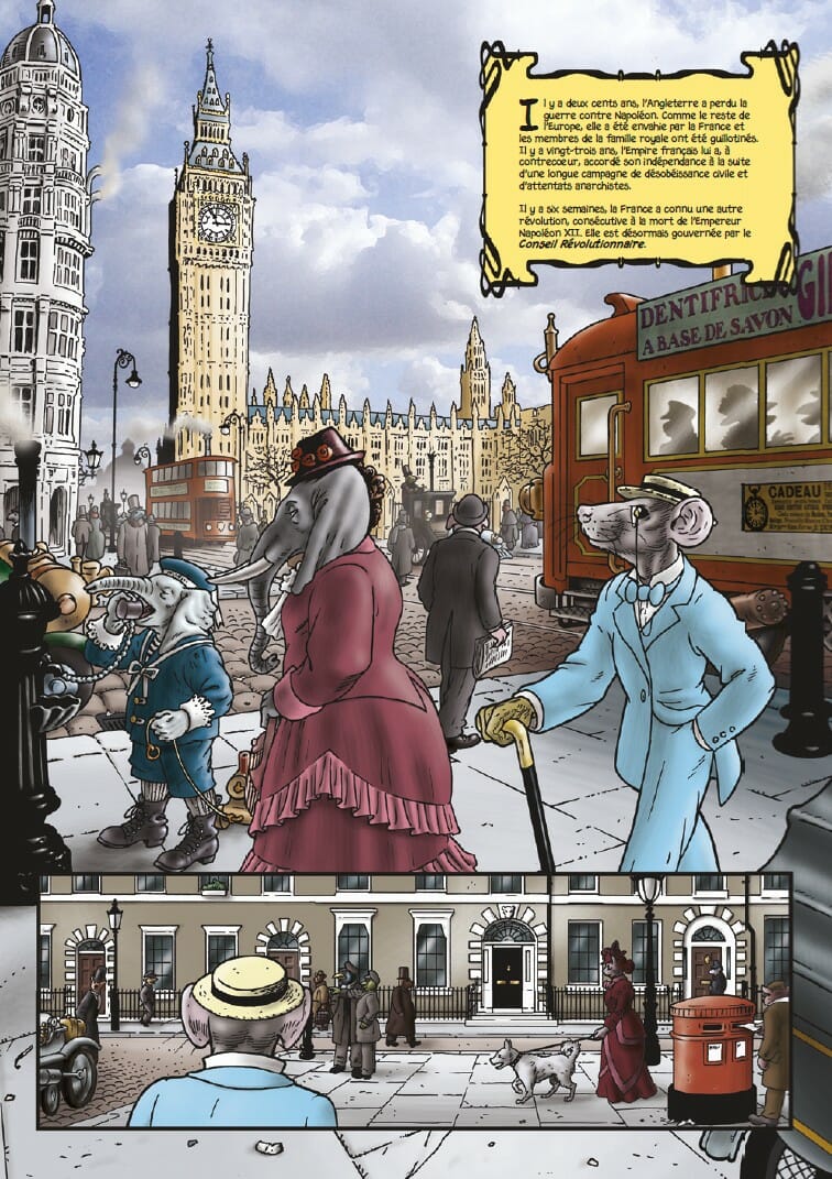 Résumé de l’éditeur : « Il y a deux cents ans, l’Angleterre perdit la guerre contre Napoléon. Comme le reste de l’Europe, elle fut envahie par la France et la famille royale fut guillotinée. » Bienvenue dans un monde où l’Empire Français règne sans partage depuis son opulente capitale rebaptisée Grandville. Mais la situation est loin d’être idyllique : les beaux quartiers au faste sans pareil de la Belle Epoque peinent à dissimuler les fissures d’un Empire qui commence à vaciller, en Europe comme dans ses lointaines colonies. La contestation sociale gronde de plus en plus fort, exacerbée par les attentats des groupuscules anarchistes et les tensions ravivées avec le voisin Anglais. C’est dans ce contexte explosif que l’inspecteur LeBrock de Scotland Yard arrive dans la capitale de l’Empire pour tenter d’enquêter sur une mystérieuse vague de crimes et de suicides. Mais le fil qu’il va commencer à dérouler risque bien de le mener face à des ennemis extrêmement puissants aux intérêts vitaux pour l’Empire.