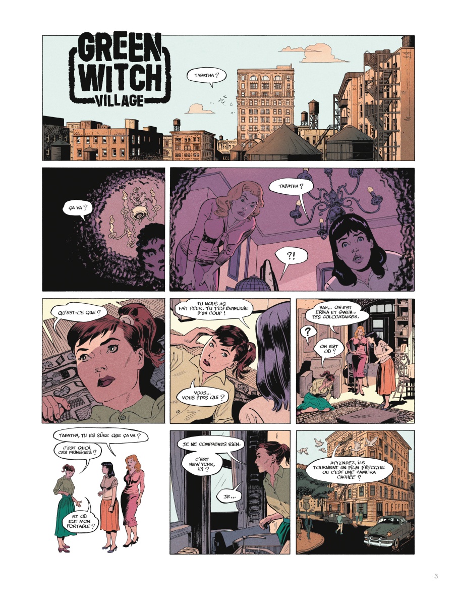 Il faut peu de temps à Lewis Trondheim (Patty télépathe) et Franck Biancarelli (Grand Est) pour faire comprendre au lecteur de Green Witch Village qu’il est face à une aventure paranormale. En effet, dès la deuxième page, l’énigmatique héroïne affirme que son esprit vient de voyager dans le temps pour se retrouver dans un corps qui n’est pas le sien. Ainsi, en jouant sur les traditionnels paradoxes temporels et autres anticipations du futur, il y avait déjà beaucoup à raconter. Et pourtant, le duo est loin de s’en contenter.