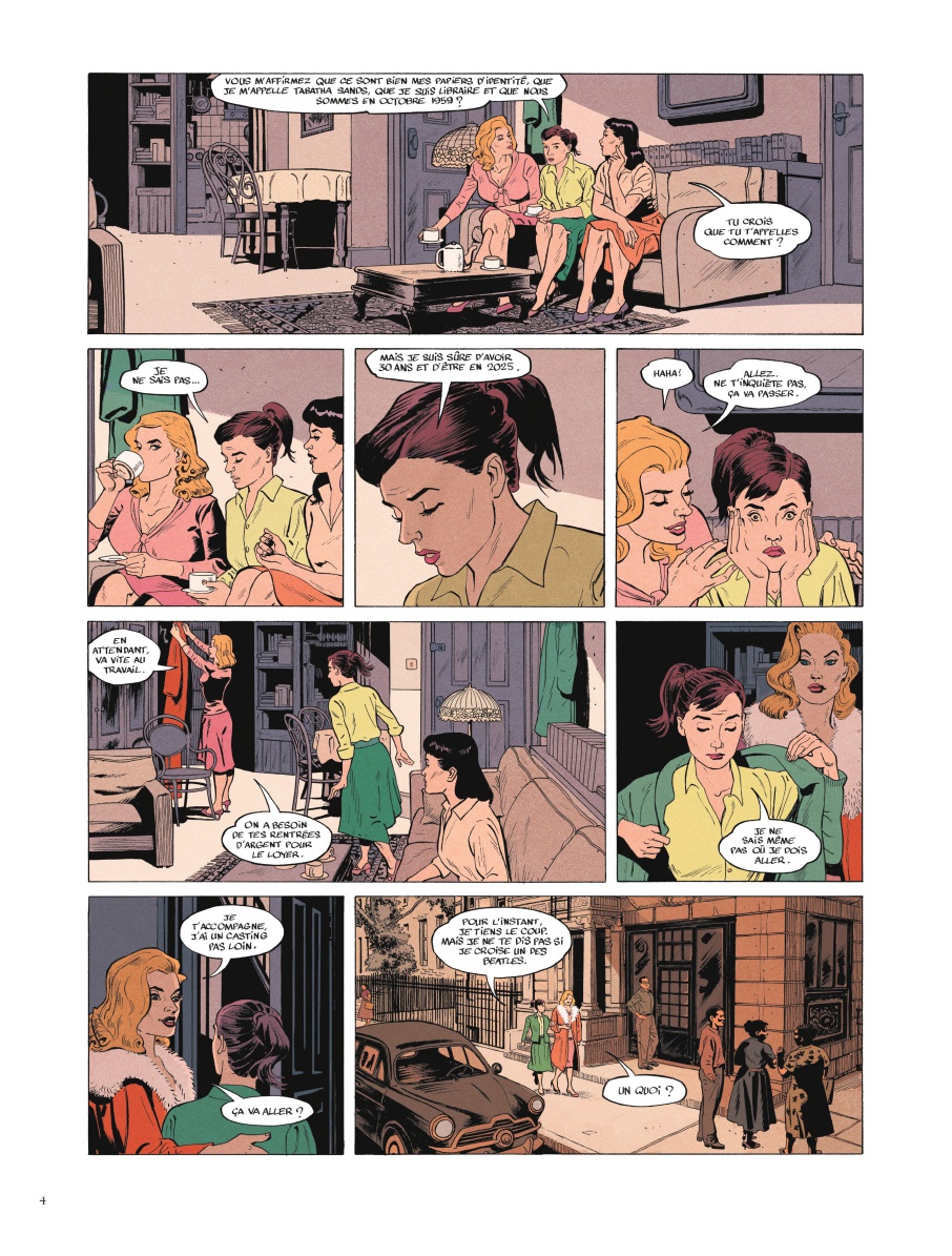 Comment s’étaient-elles rencontrées ? Par hasard, au moment même où elle avait ouvert les yeux en 1959. Comment s’appelaient-elles ? Elle, on l’appelait Tabatha Sands, mais elle était convaincue que ce n’était pas son nom. Et les deux autres, ses colocataires, Érika et Gwen. D’où venaient-elles ? Elle, de 2025 ; elle en était certaine. Quant à ses deux nouvelles amies, elles venaient bel et bien de 1959.