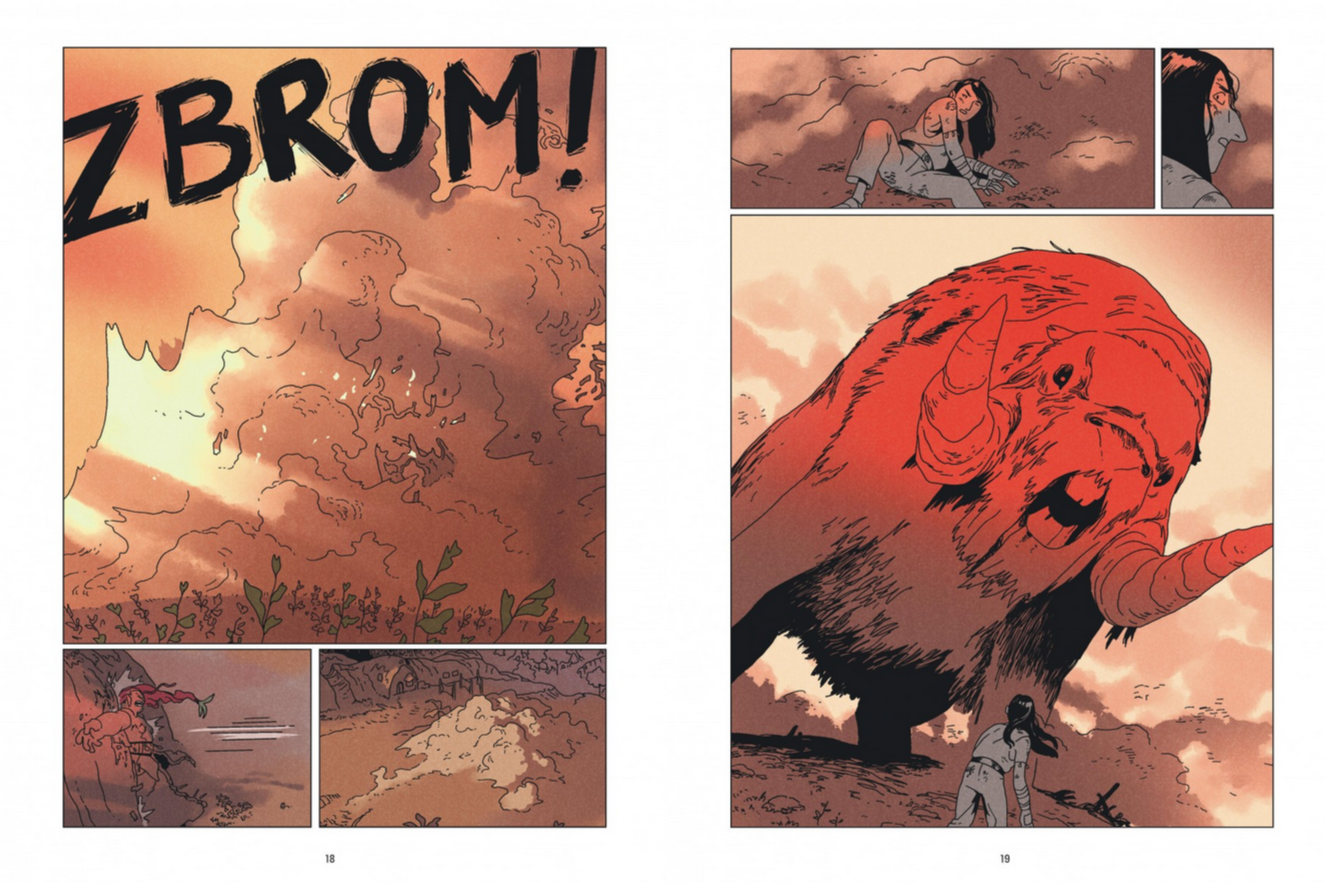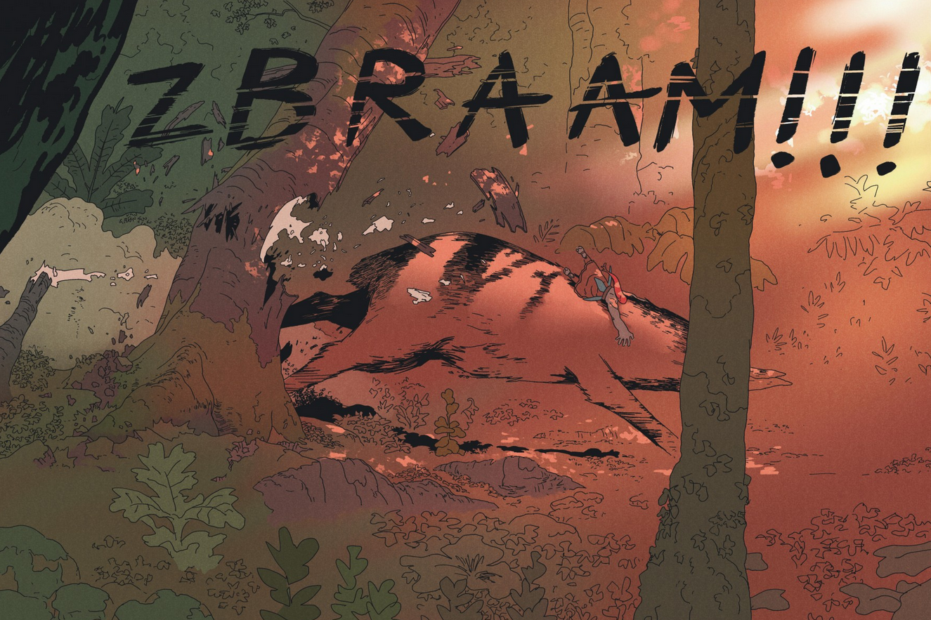 Un cahier graphique d’une quinzaine de pages est intégré à la fin de l’album et laisse apercevoir le travail de recherche minutieux de Motteux sur les chara design, les décors ou encore la palette de couleurs. Des rouges intenses qui soulignent toute la violence de la chasse aux verts profonds qui caractérisent le calme de la forêt, il manie cette dernière avec beaucoup de précision pour faire varier l’intensité de chaque événement et de chaque émotion. Il réussit grâce à son dessin à faire écho en profondeur au travail d’écriture de Léo Schilling.