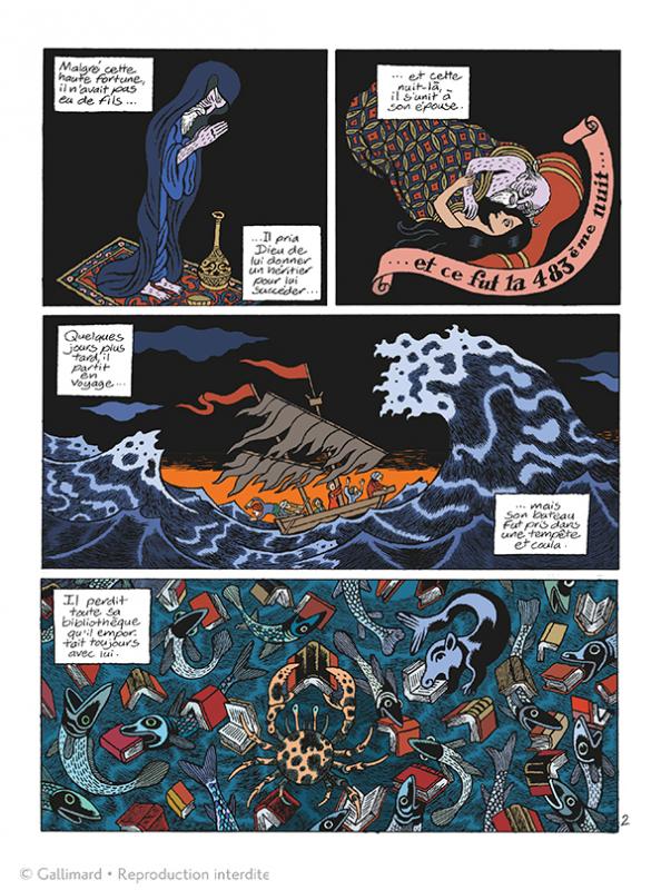 Ce très bel ouvrage jeunesse de David B. ravira aussi les plus grands, tant les qualités narratives et graphiques sont réelles. Pour décliner cette légende des Mille et une nuits, l’auteur a décidé d’entremêler avec une grande habileté trois contes, qui ont chacun un univers graphique différent même si l’album possède un belle unité. En effet, il met en image la destinée de trois protagonistes : Hâsib est composé d’un trait fidèle à son graphisme, celui de Buluqiyya est empreinte d’orientalisme, d’arabesque et d’entrelacs, tandis que celui de Jânshâh est extrêmement précis et méticuleux. Ce cheminement graphique permet d’apporter un souffle épique fort puisque le dessin se réinvente au fil des pages. Il n’y a plus qu’à attendre le second volet de cette belle fresque orientaliste.