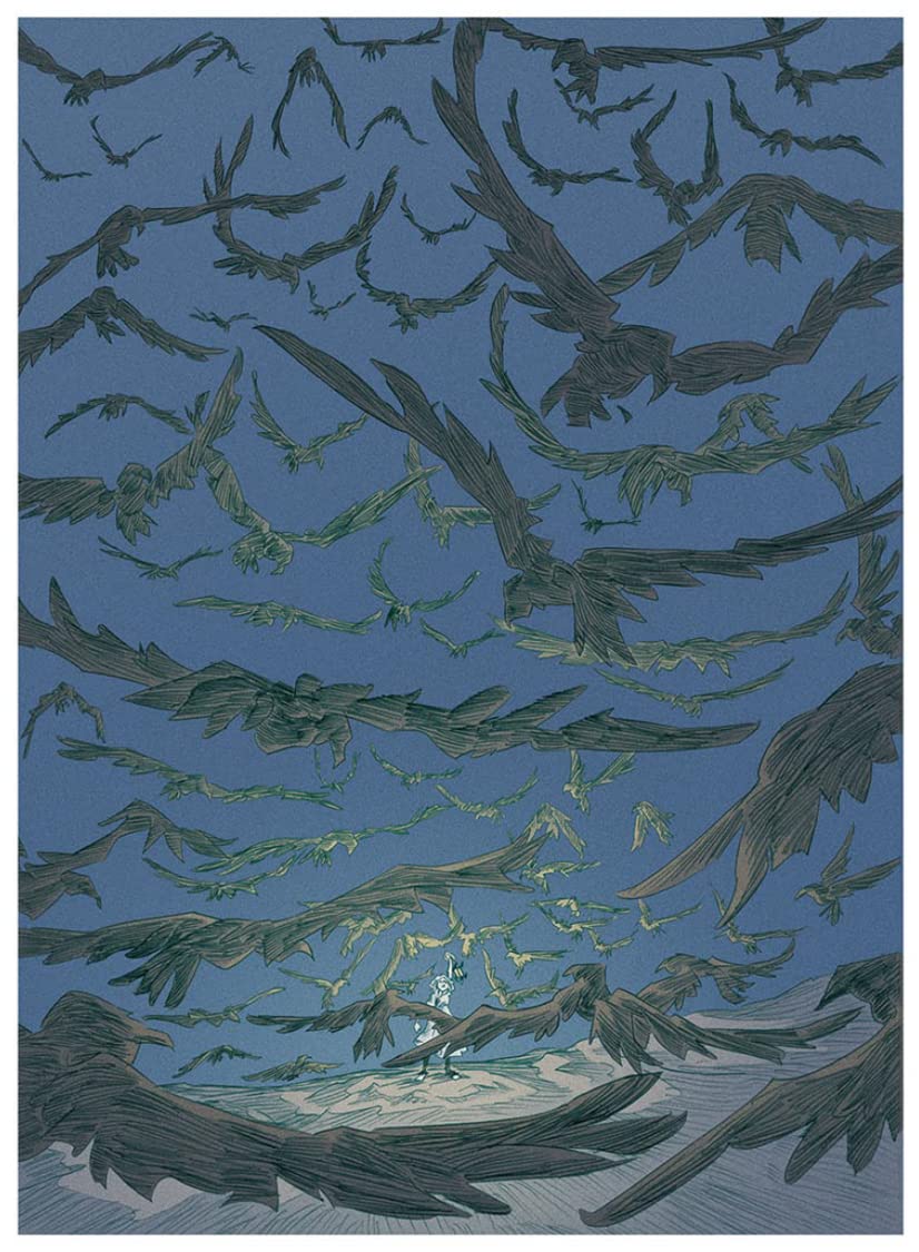 Dans la mesure où il se charge aussi de la partie graphique, Philippe Scherding réalise une prestation parfaitement cohérente avec les thèmes abordés. Ainsi, un paysage lunaire se dessine dans un camaïeu bleu-gris extrêmement envoûtant. Chaque ombre parfaitement disséminée apporte son lot de danger. Et au milieu de ces tableaux azurins, Hel tente tant bien que mal de produire une pâle source de lumière, ultime signe d’espoir. Une belle réussite qui nous transporte au sein de tableaux magnifiques dans une ambiance expressionniste épurée.