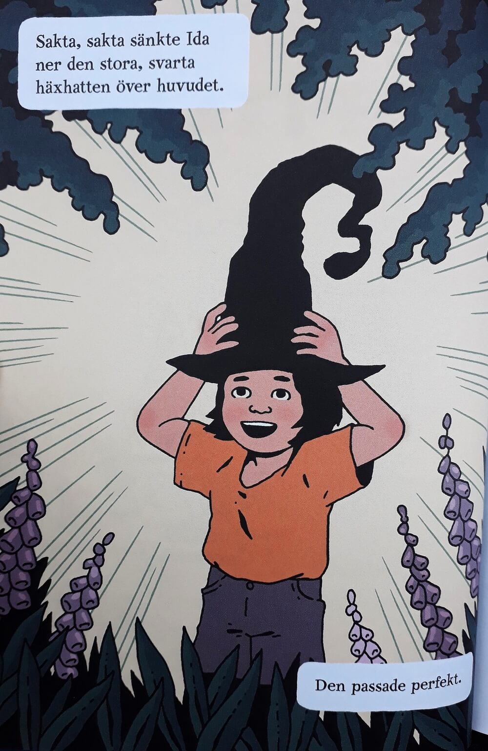 Résumé de l’éditeur : Ida est une petite fille bien solitaire et qui s’ennuie trop souvent. Lorsqu’elle trouve par hasard un grand chapeau noir, des choses étranges commencent à se produire… À la plage, des châteaux de sable gigantesques jaillissent du sol. À l’école, une portion de spaghetti devient un petit dinosaure rugissant tandis que son cahier se transforme en oiseau. Le chapeau a t-il doté Ida de pouvoirs magiques ? Serait-elle devenue une… une sorcière ?