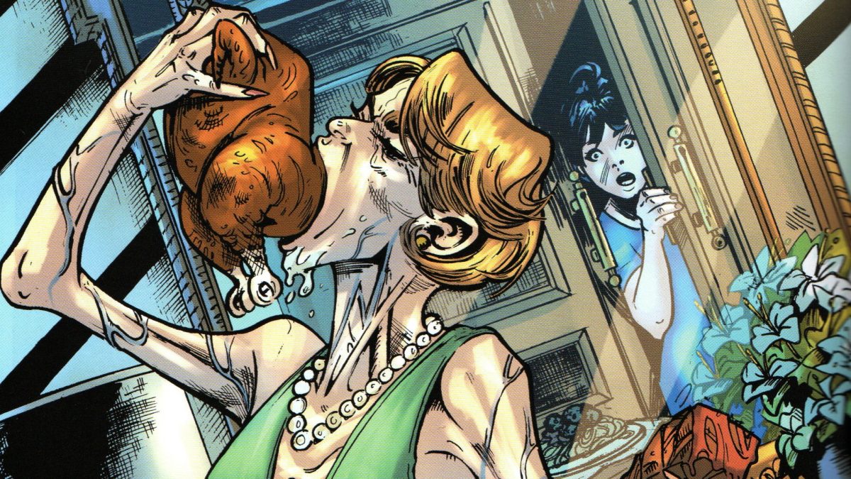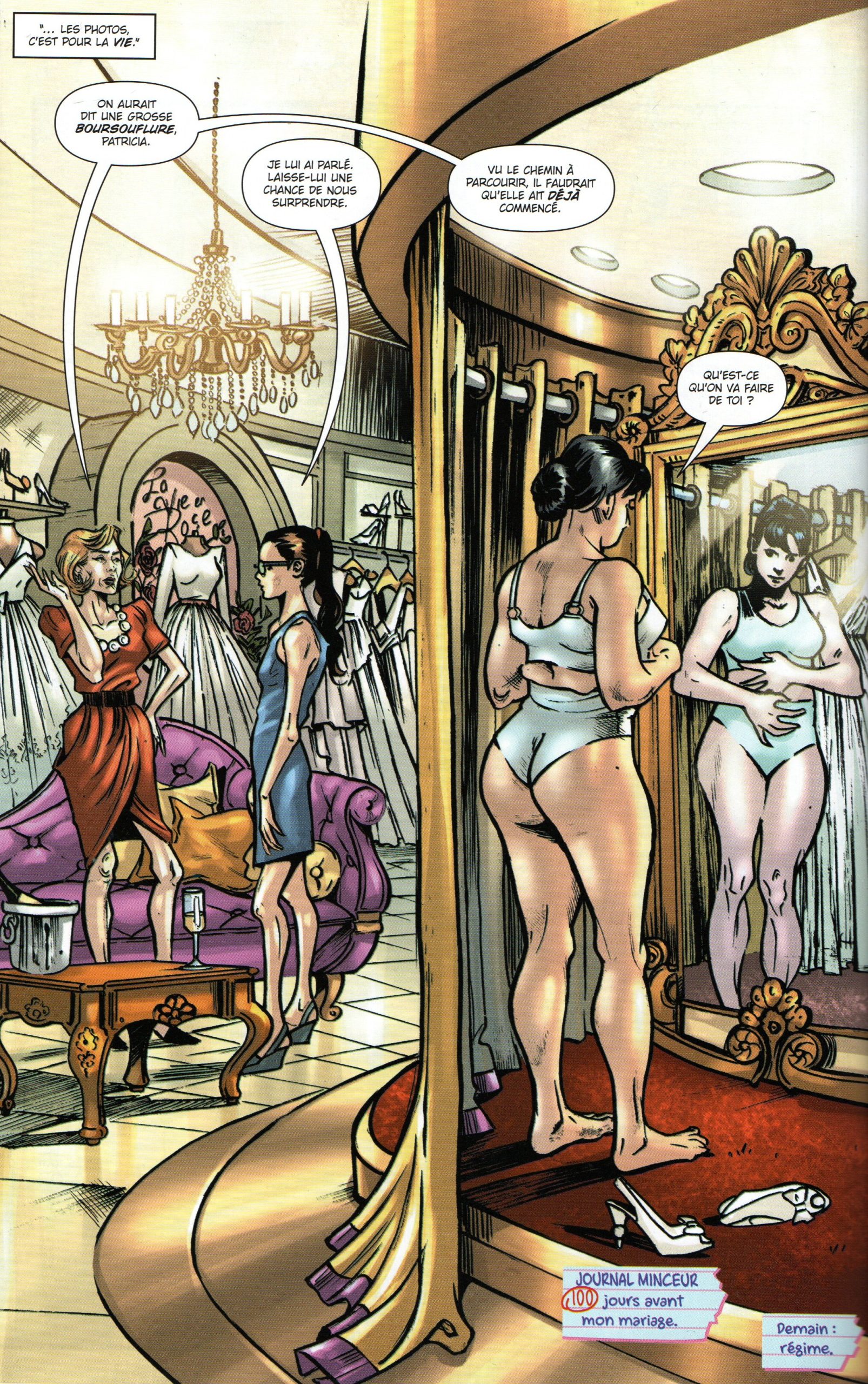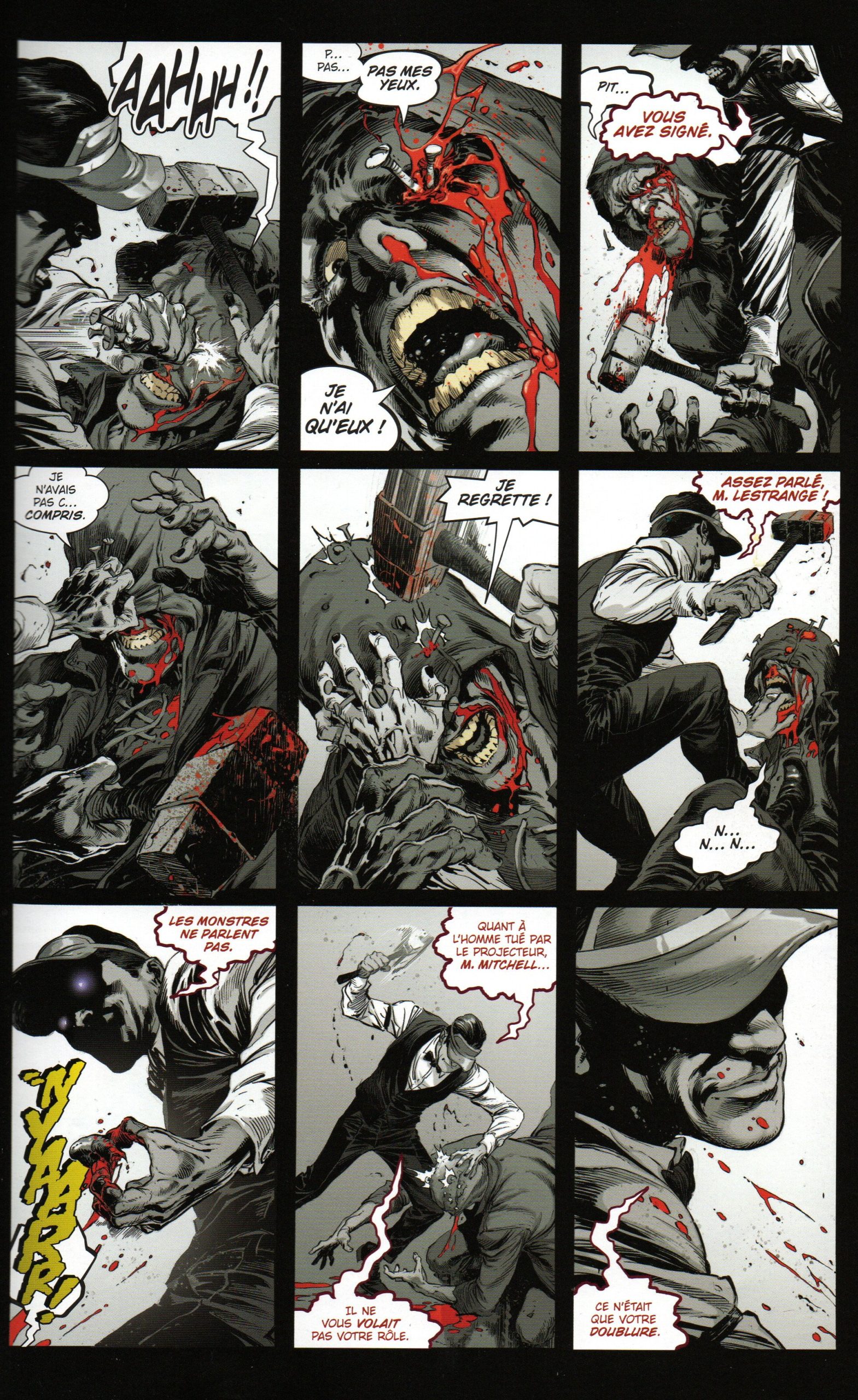 La disparité des graphismes proposés est telle qu’elle permet difficilement d’apprécier équitablement l’ensemble des chapitres. De telles différences résultent de la collaboration avec pas moins de quatre dessinateurs et deux coloristes différents. Chacun se chargeant à tour de rôle des différents chapitres, sans qu’aucune mention de crédit ne soit faite en tête de chapitre. Il est alors difficile, même après enquête, de pouvoir nommer l’artiste à l’œuvre sur tel ou tel chapitre. J’ai beaucoup aimé le trait proposé sur le chapitre 4, les mésaventures cinématographiques d’Oscar Lestrange, ainsi que le chapitre « Dévore » qui retrace l’histoire familiale de Lily. Une jeune femme qui peine à rentrer dans sa robe de mariée, au grand damne de sa mère et de sa grand-mère aux physiques faméliques. A contrario, je suis bien moins convaincu par le chapitre 5 qui expose les évènements qui précipitèrent la chute de Mlle Bienfaite.