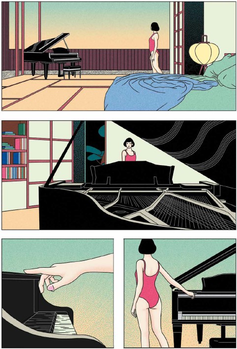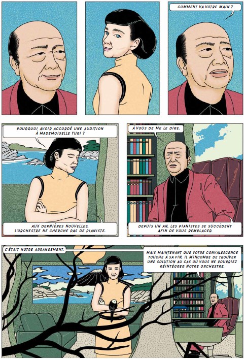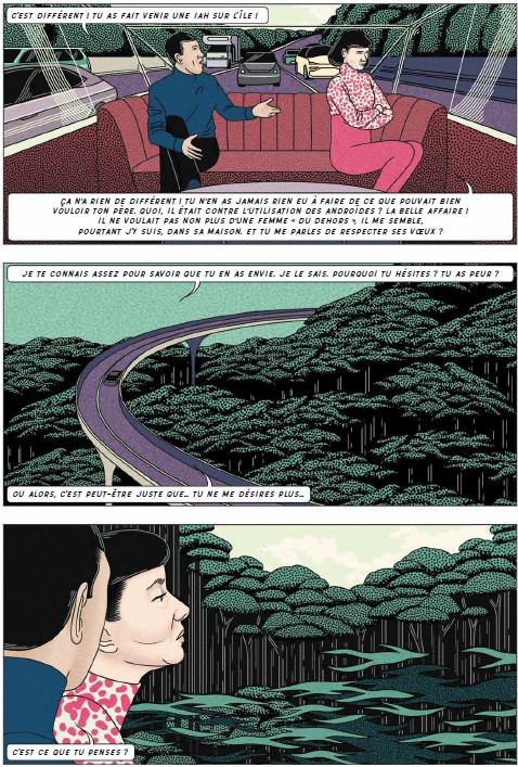 Résumé de l’éditeur : Les androïdes ont envahi la vie quotidienne, dans le monde entier, partout, sauf au Japon où ils sont interdits. Et en particulier sur l’île très conservatrice de Kino qui résiste à la modernité et aux nouvelles technologies, pour reproduire un Japon de la fin du XXe siècle, gardé sous cloche de verre. Dans cette enclave idéale d’un monde disparu, Hélène et Edo, mari et femme, vivent heureux depuis de nombreuses années. Mais s’il est figé dans l’île de Kino, pour le couple, le temps commence à leur jouer des tours. Pianiste de renom, Hélène voit en effet sa place au sein de l’orchestre symphonique mise en péril depuis l’arrivée d’une musicienne plus jeune et plus talentueuse qu’elle. De son côté, Edo sent que son désir pour sa femme s’étiole peu à peu. Alors, Hélène décide d’introduire dans leur maison un robot, clone parfait d’elle quand elle était jeune, et programmé pour satisfaire les désirs de ses propriétaires. Mais quand on transgresse les lois, qu’elles soient celles des hommes, de l’amour ou du temps, le prix à payer peut s’avérer élevé…