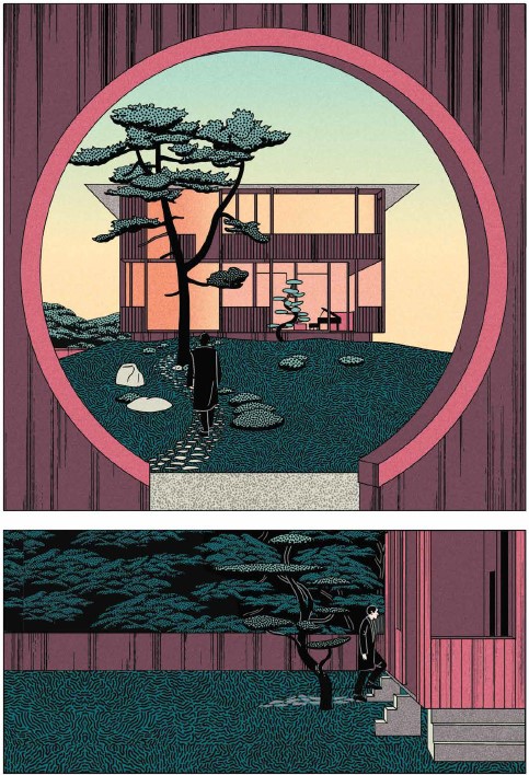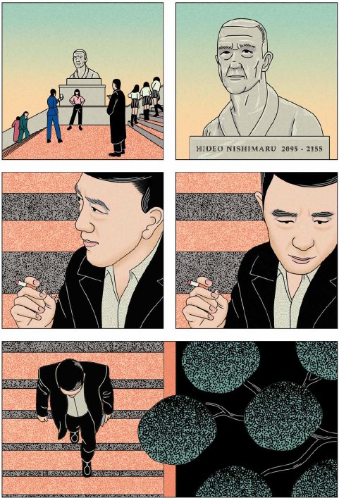 Rares sont les albums dont on a envie, voire besoin, de faire une première lecture visuelle. C’est le cas avec cet Idéal. En effet, sur les premières pages qui se dévoilent à nous ne figurent aucun mot. Elles nous permettent ainsi de nous insérer très progressivement dans cet étonnant univers qu’on a beaucoup de mal à dater. C’est ainsi que l’on ne découvre l’époque, à laquelle se déroule ce récit, que grâce au dessin d’une statue où il est indiqué « Hideo Nishimaru 2095 – 2155 ». Nous sommes donc dans le futur, alors qu’aucun autre indice ne pouvait nous le confirmer.