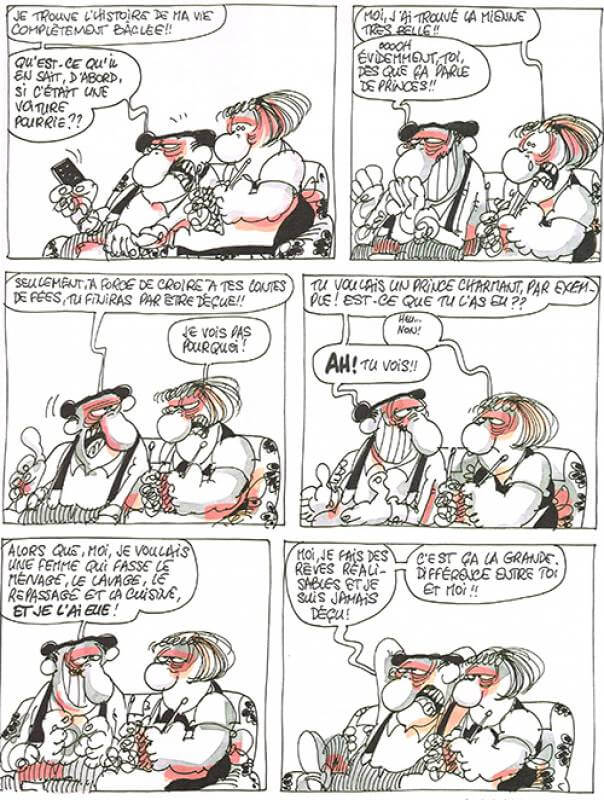 Dans une interview donnée à Yves Frémion ( reproduite dans cette anthologie) Christian Binet dit être parti de son vécu pour créer ce couple inédit: » Il y a toujours un peu d’exagération, c’est une caricature, de l’humour, donc à un certain moment je pousse plus loin, mais tous les points de départ sont authentiques « . Quand on lit les Bidochon, et c’est là la force de leur géniteur, on se trouve souvent face à un paradoxe: on sourit ou on rit devant leur bêtise, leurs manies, leurs tics et leur mauvaise foi mais on a aussi envie de les soutenir tant parfois ils nous ressemblent. Car si ces deux-là s’engueulent bien souvent, on sent aussi au fond d’eux-mêmes quelque chose de sincère et d’attachant. Des problèmes de fertilité de Monsieur aux rêveries romantiques de Madame en passant par l’achat d’une maison, la découverte de l’informatique ou du téléphone portable, ces deux là ont traversé comme nous les évolutions de la société française à travers quatre décennies. Souvent certes de manière décalée, mais proche d’une réalité connue…