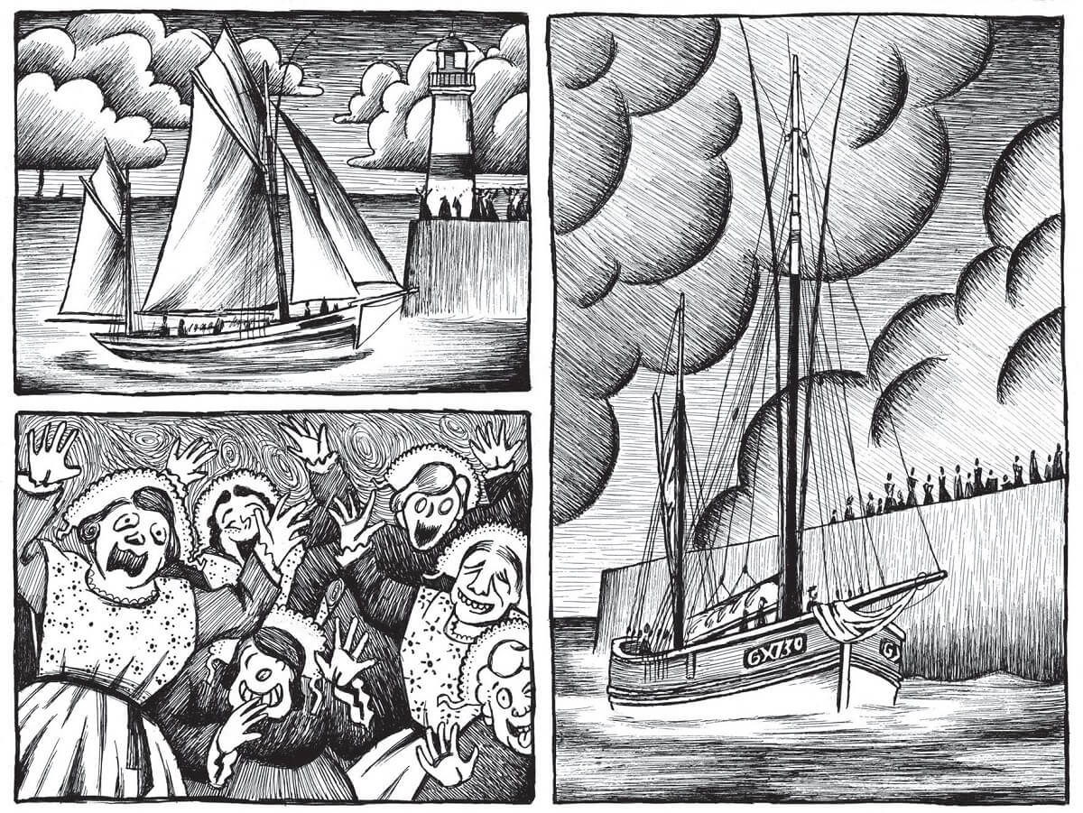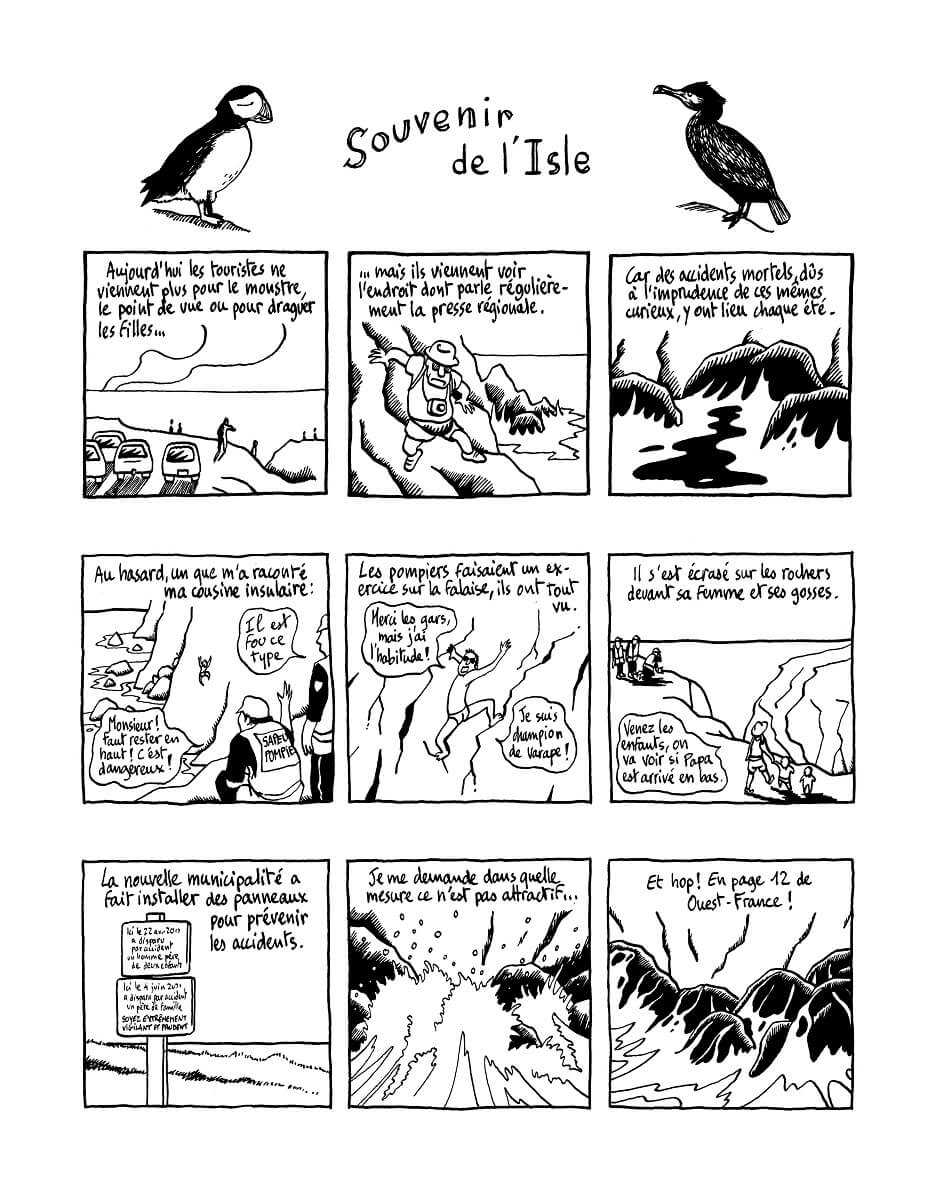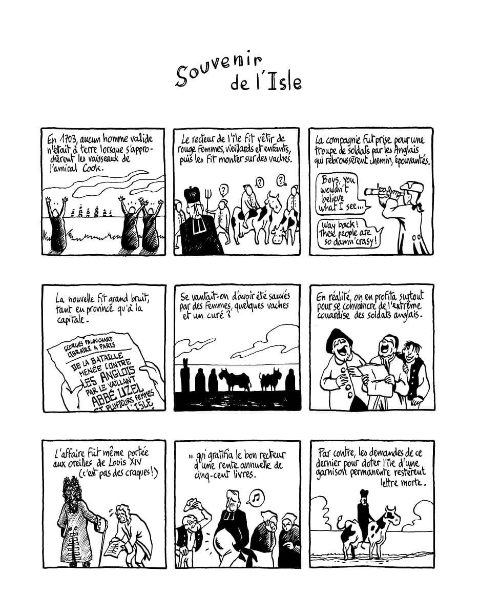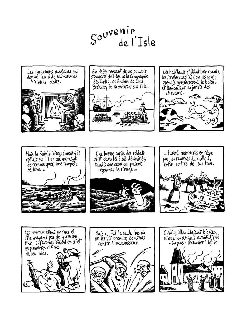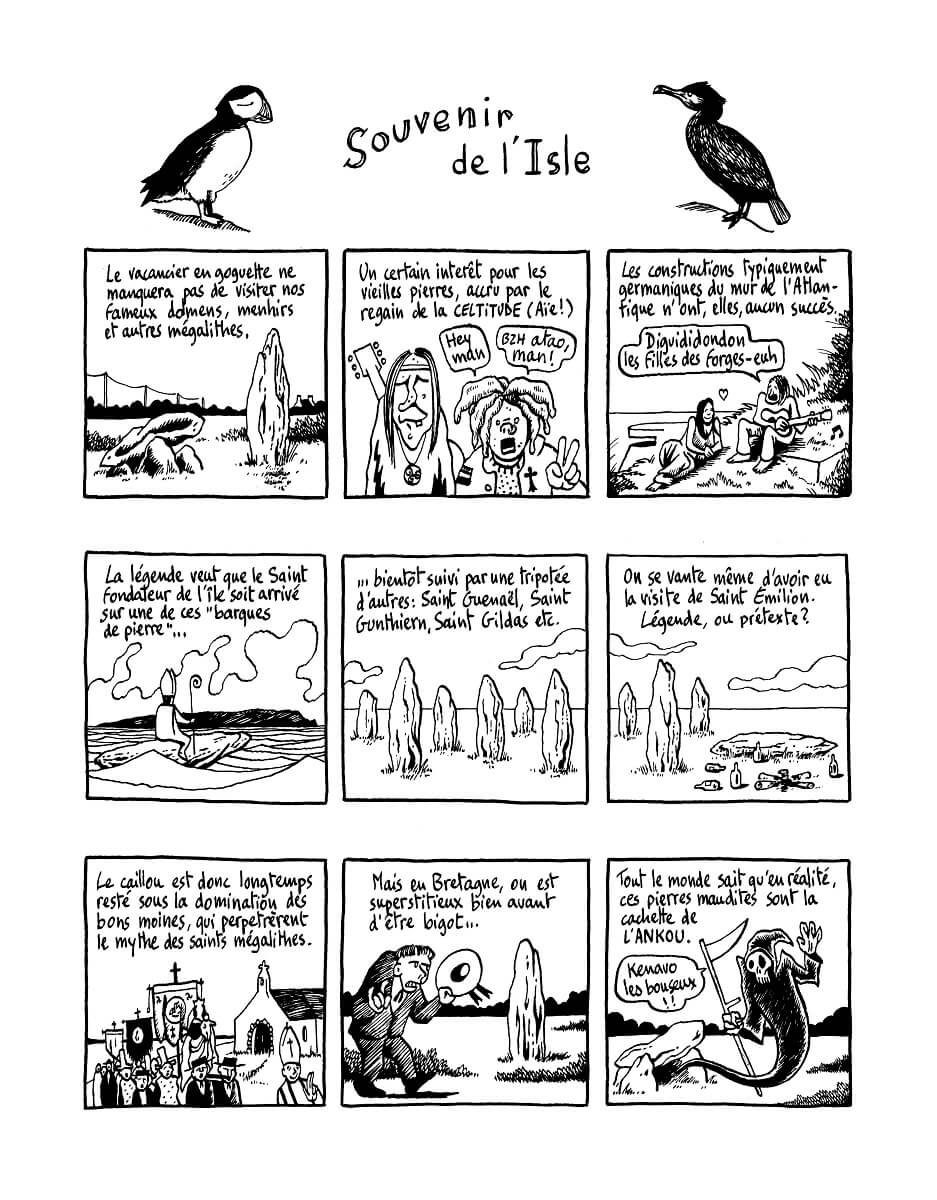 Ile du Morbihan, ce lieux est souvent isolé du reste du continent et peut vivre parfois en autarcie. Il a aussi charrié son lots de légendes en tout genre. Prosperi Buri les a utilisé, martyrisé et amplifié. Il a alors imaginé de courts récits décalés et souvent très drôles. Ainsi Insulaires regroupe ces contes modifiés par l’auteur de La montgolfière (Warum) :