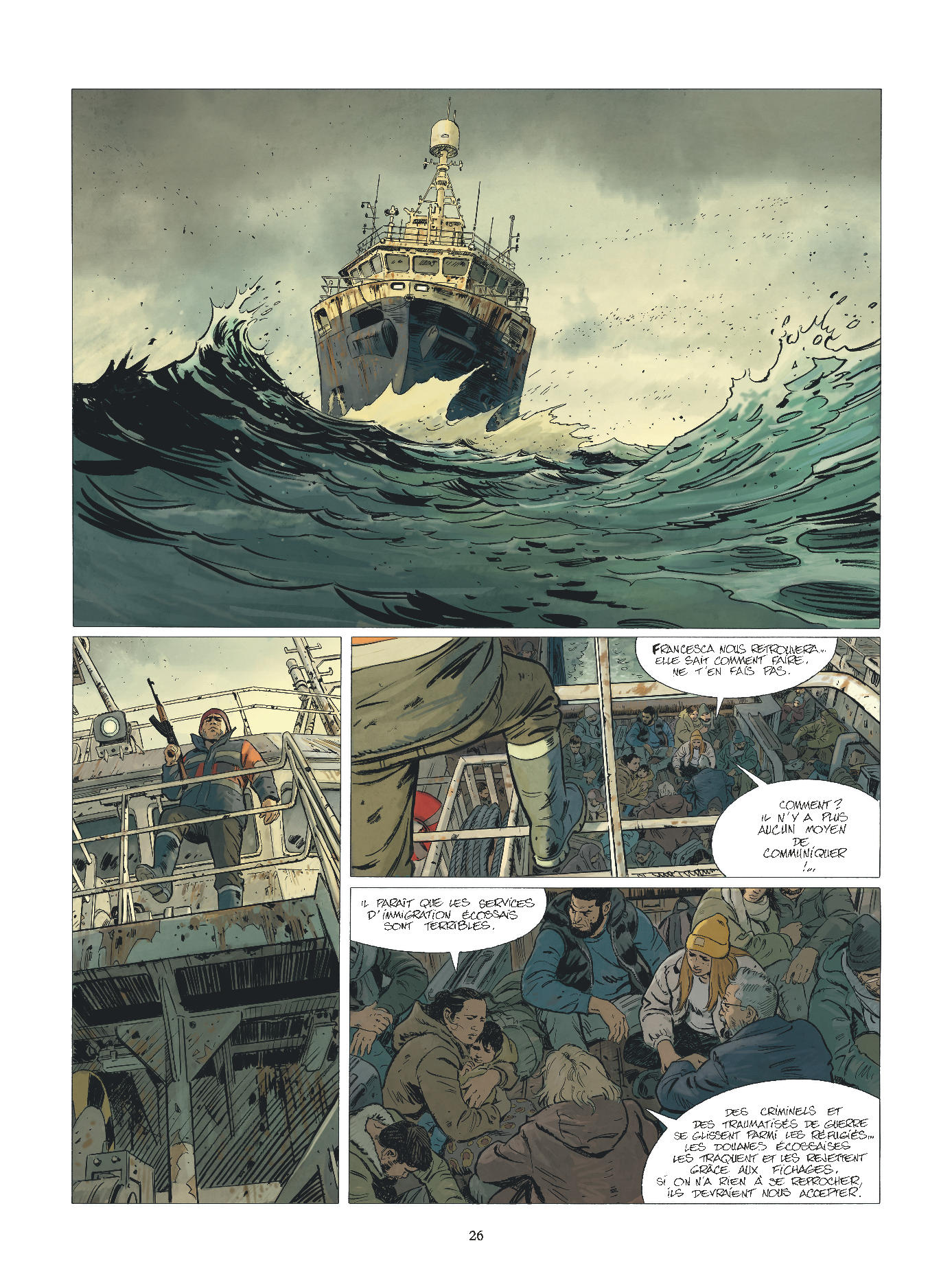 Le Havre, port d’exil, devient le théâtre d’un voyage sans retour. Là, plusieurs réfugiés, essentiellement européens, attendent désespérément de traverser la mer du Nord, pour se rendre en Écosse. Parmi eux, se distingue un petit groupe de deux hommes et deux sœurs qui sont les premiers protagonistes du récit. Dans cette ambiance anxiogène, le professeur Zizek semble détenir une information importante. Assez pour être escorté par Raph qui inspire de la méfiance à Francesca et Livia, les deux jeunes femmes qui les accompagnent.