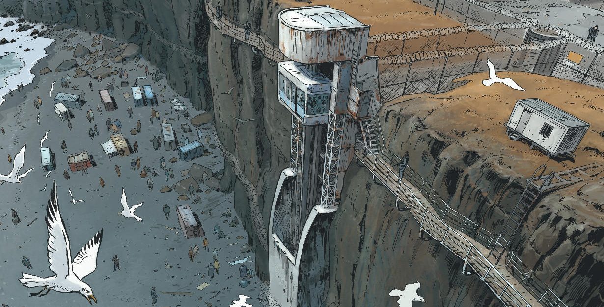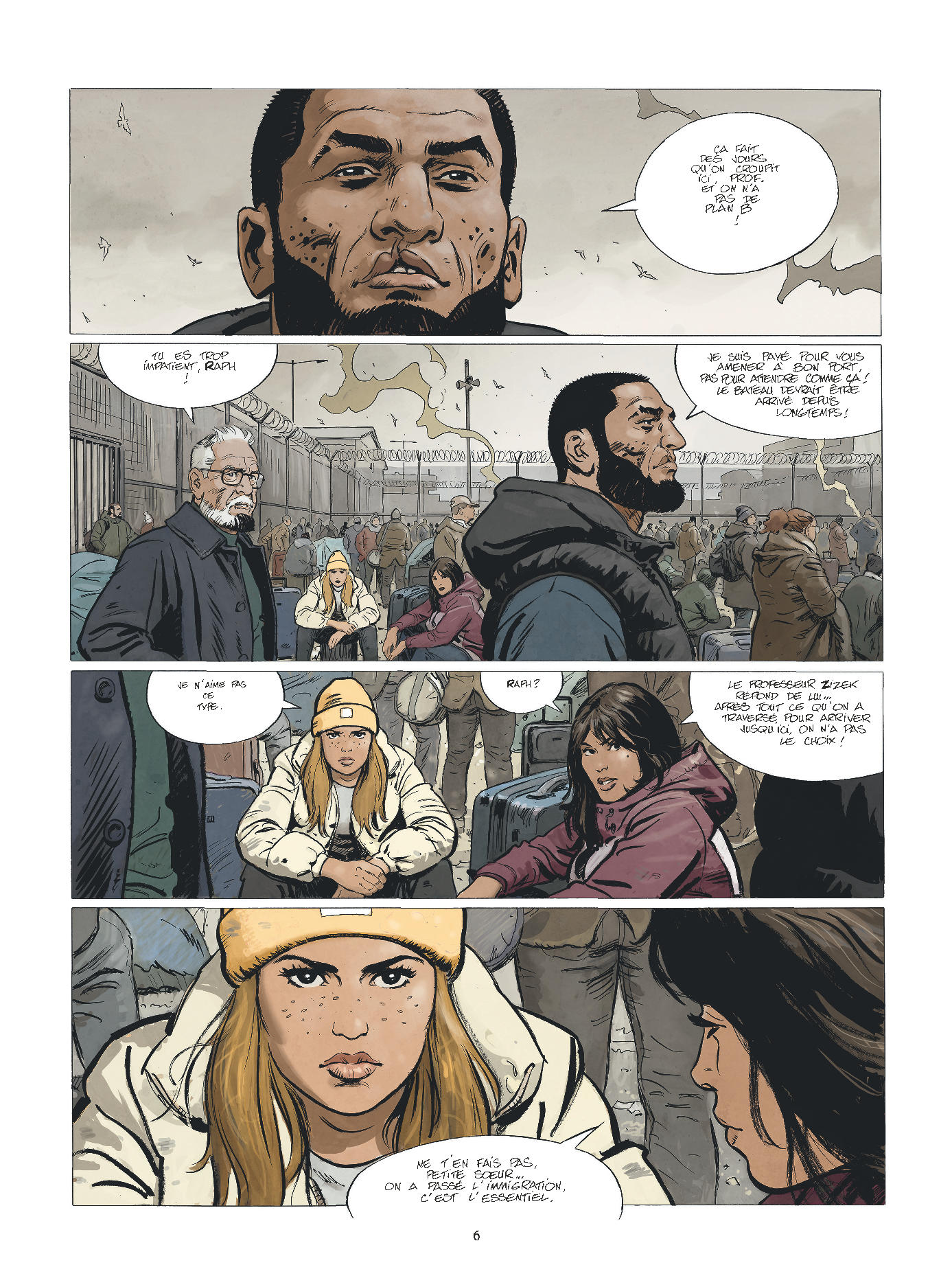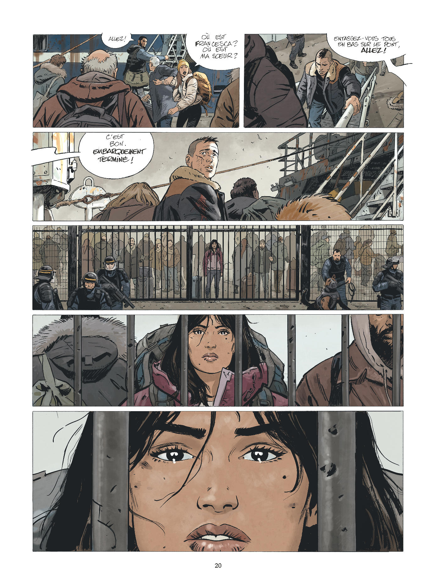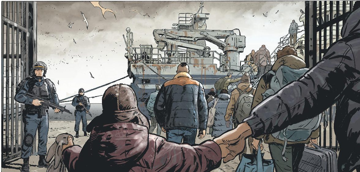 Dès le début de ce premier tome, le décor est planté : le continent européen est plongé dans une tourmente sans nom : guerres, dérèglements climatiques, crises sanitaires. Les habitants, pris au piège de cette dévastation, se retrouvent contraints à fuir. Et c’est ici que réside la force de cet album : Caryl Férey et Corentin Rouge n’hésitent pas à inverser les rôles : ce sont désormais les Européens, jadis observateurs, qui deviennent des migrants. Un retournement de situation qui fait froid dans le dos.