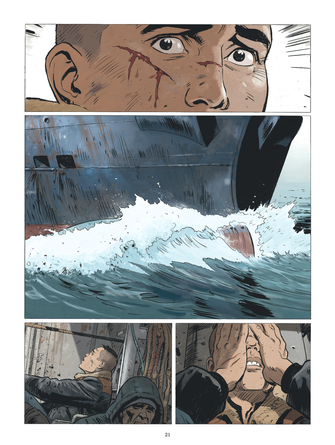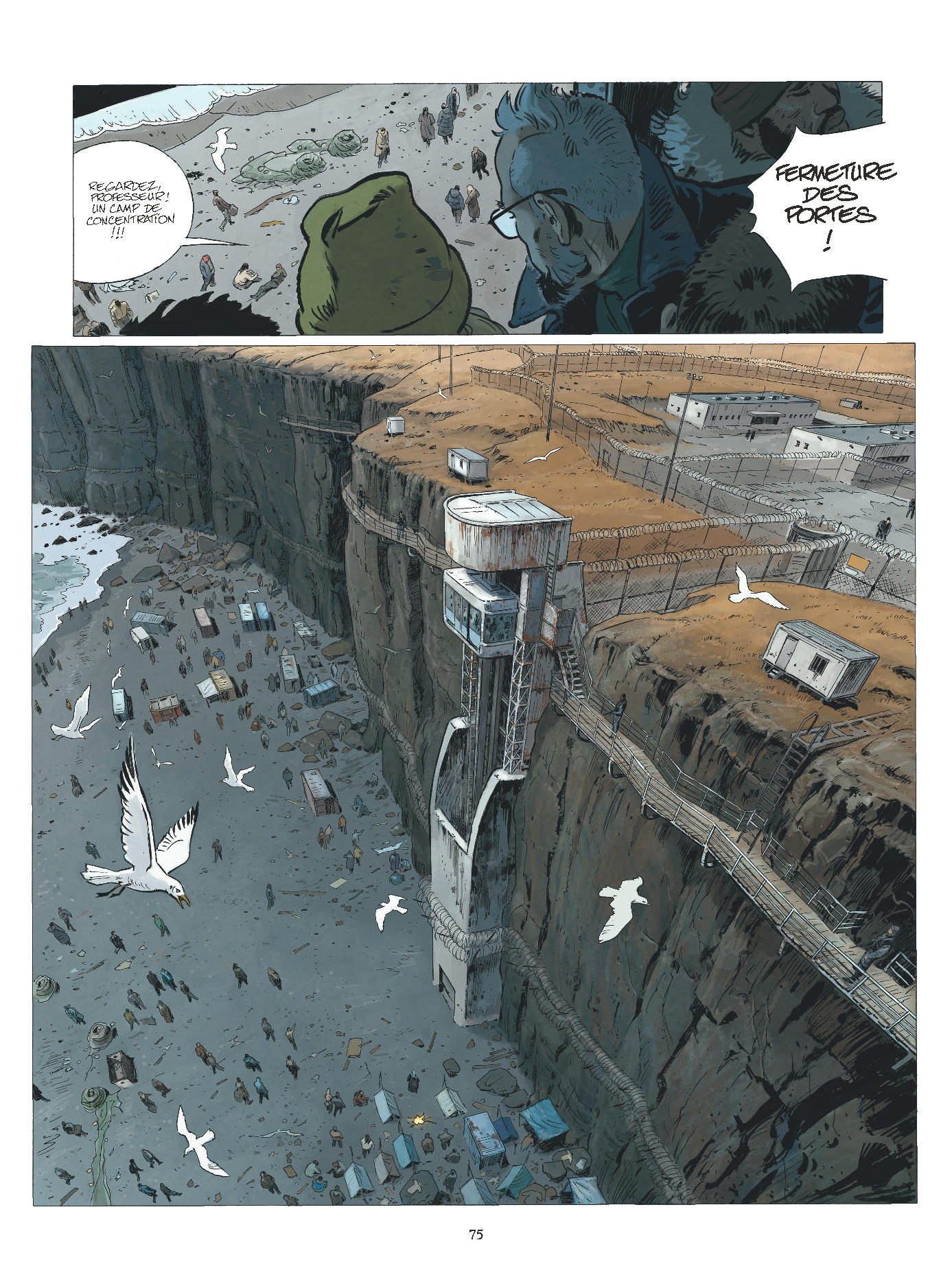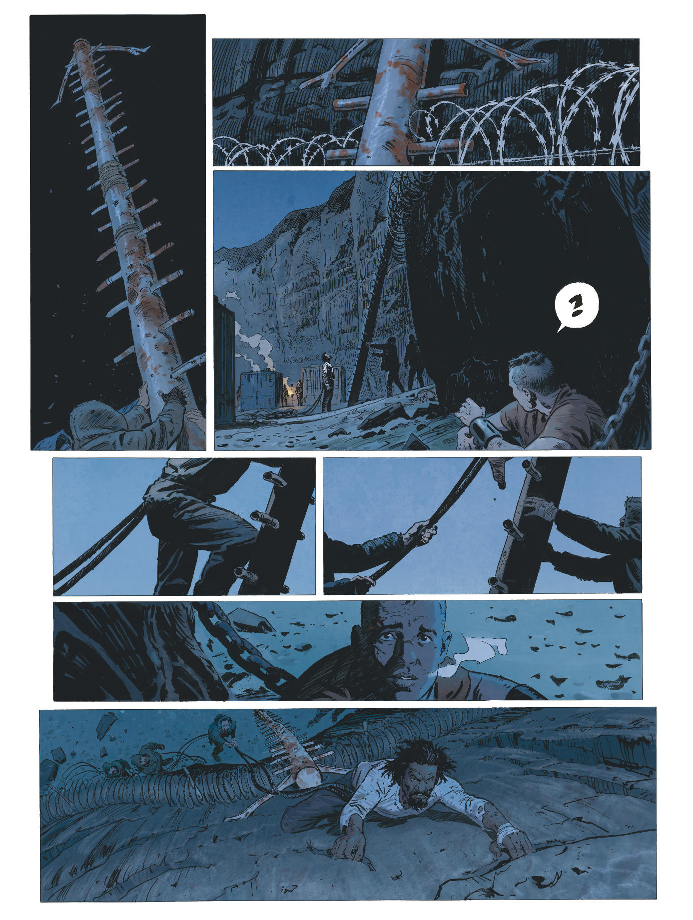 Dès le début de ce premier tome, le décor est planté : le continent européen est plongé dans une tourmente sans nom : guerres, dérèglements climatiques, crises sanitaires. Les habitants, pris au piège de cette dévastation, se retrouvent contraints à fuir. Et c’est ici que réside la force de cet album : Caryl Férey et Corentin Rouge n’hésitent pas à inverser les rôles : ce sont désormais les Européens, jadis observateurs, qui deviennent des migrants. Un retournement de situation qui fait froid dans le dos.