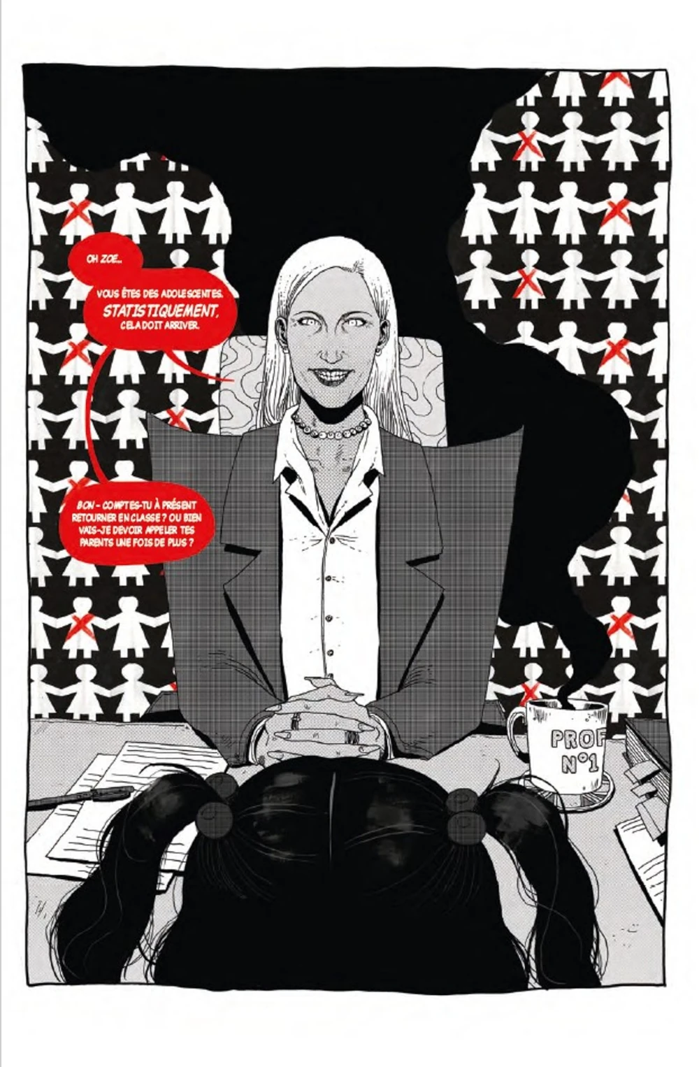Pour appuyer son propos, son visage change. Lorsqu’elle semble aller bien, elle arbore sa longue chevelure et des traits semi-réalistes. Tandis que lorsqu’elle est au bord du gouffre, sa figure n’est faite que d’une simple rond, un nez, des oreilles mais pas de cheveux. Quant aux personnages autour d’elle, ce sont des animaux. L’anthropomorphisme lui permet une distance vis-à-vis d’eux mais aussi de leurs discours.