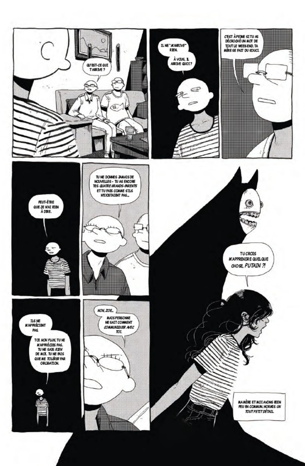 Enfin, Zoe est souvent accompagnée par un Kaonashi monstrueux. Ce No Face est un personnage important du Voyage de Chihiro d’Hayao Miyazaki. Comme dans le film d’animation, il mange beaucoup (pas des êtres humains néanmoins). Serait-il la conscience de Zoe ? Il est là pour la secouer, pour lui dire certaines vérités.