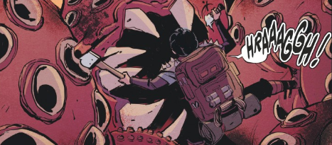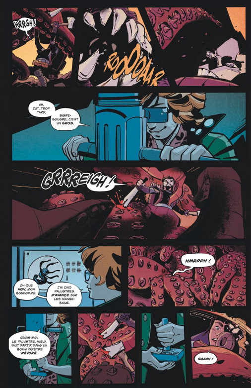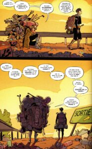 Ces derniers, une troupe de scouts endoctrinée à l’extrême par Maw, la matriarche- gourou, veulent à n’importe quel prix remettre la main sur Mezzi et le précieux bien qu’elle a subtilisé lorsqu’elle s’est fait la belle. Il est donc impensable pour elle de s’embarrasser du poids mort que représente Macéo. Il est armé de toute son innocence n’a aucune expérience de survit dans la friche. De surcroit il s’est mis en tête de coller aux basques de sa nouvelle amie, chargé d’un barda monumentale. Un bric-à-brac impensable qui va très sérieusement ralentir la cadence, mais dans lequel Macéo va pouvoir puiser pour bricoler d’ingénieux dispositifs qui par moment assureront leur progression.
