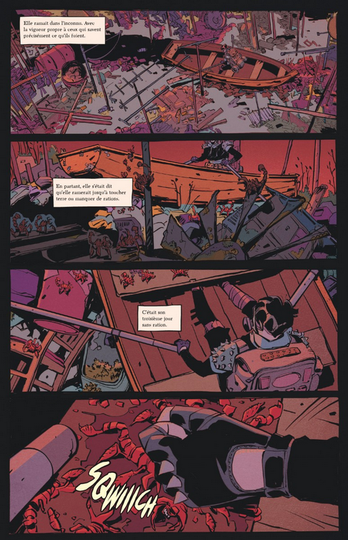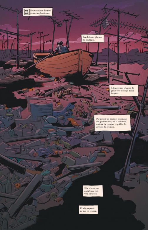 Résumé de l’éditeur : Voilà des jours que Mezzy navigue sur sa barque de fortune, traversant des continents de plastique fondu, évitant des abysses infernaux et des geysers de feu noir. Elle n’a pas croisé âme qui vive depuis des lunes, et ses vivres sont à présent épuisés. Elle n’a maintenant d’autre choix que d’errer dans une jungle urbaine hostile où elle espère trouver de quoi se nourrir. Mais une rencontre inattendue va tout changer. Le jeune Maceo, avec lequel elle n’a rien en commun, entre soudain dans sa vie. Vaut-il mieux parcourir une planète ravagée seule, ou accompagnée ?