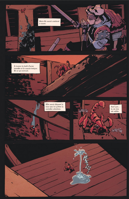 Sur cet océan de détritus, Ezmerelda, dit Mezzi, navigue sur une embarcation de fortune dont le naufrage imminent l’oblige à faire escale sur la partie encore émergée d’un gratte-ciel d’une ville noyée sous les eaux. Mezzi est une warrior, une survivaliste. Armée de couteaux tranchants et autres objets contondants, elle trimbale avec elle un package léger et arbore des équipements de protection pour se prévenir de pas mal de dangers.