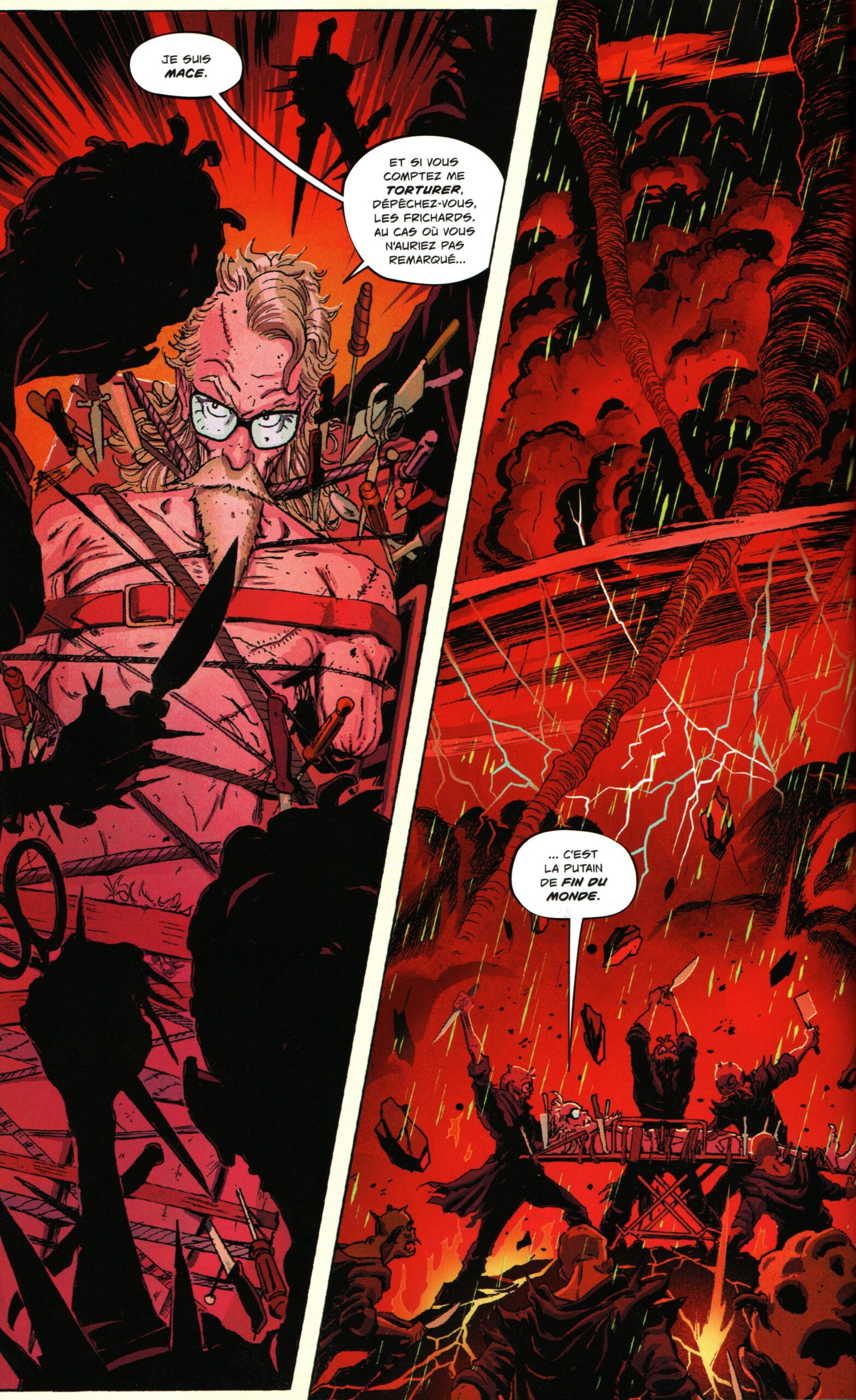 Là on y découvre un Macéo, sémillant vieillard dans une situation fort peu enviable. Une situation extrêmement critique avec un Macéo « upgradé » qui vend très chère sa peau. Une scène scindée en trois temps, très prometteuse pour la suite de ce récit qui oscille avec justesse entre le trash humoristique et la comédie survivaliste désespérée.