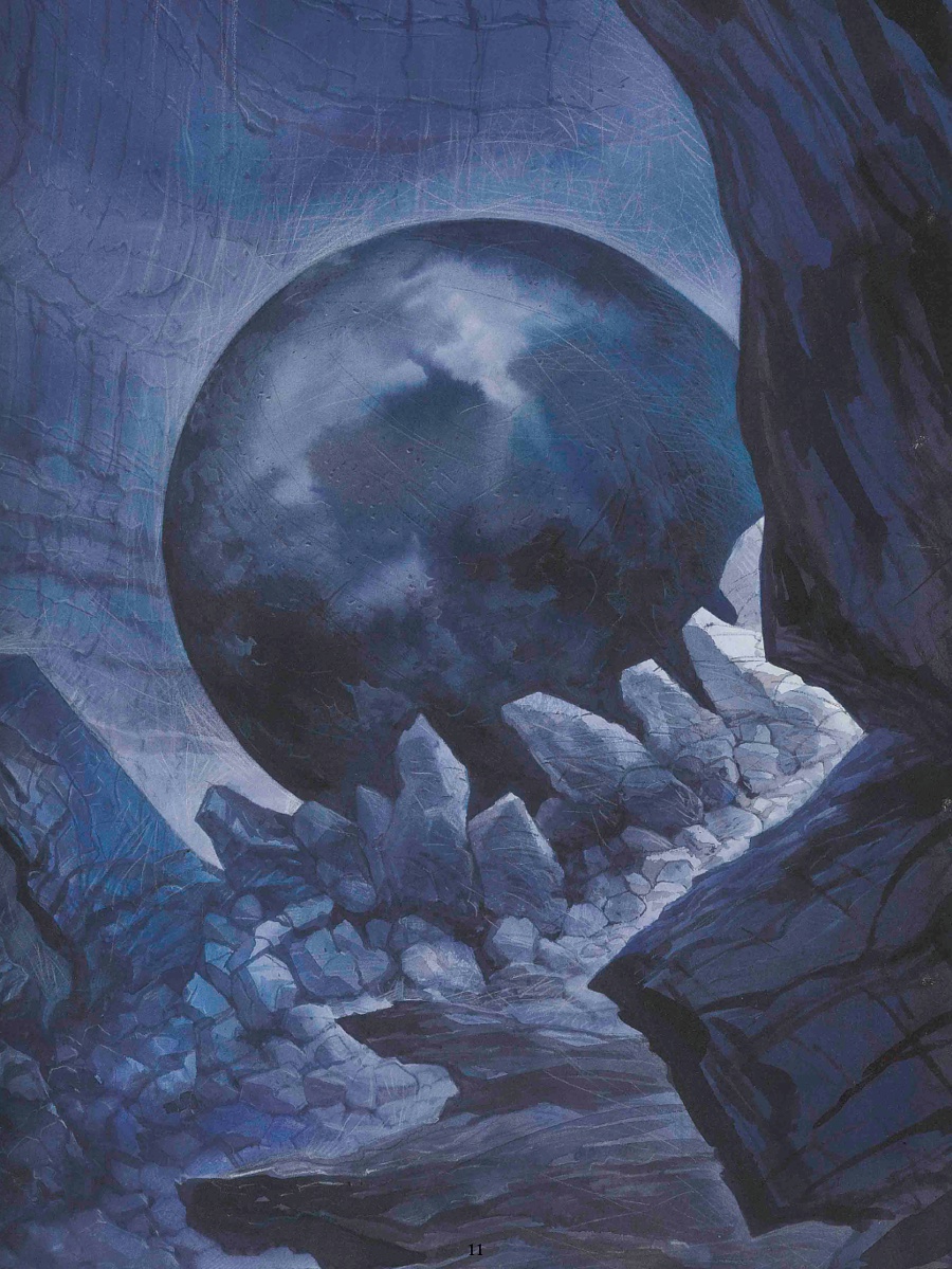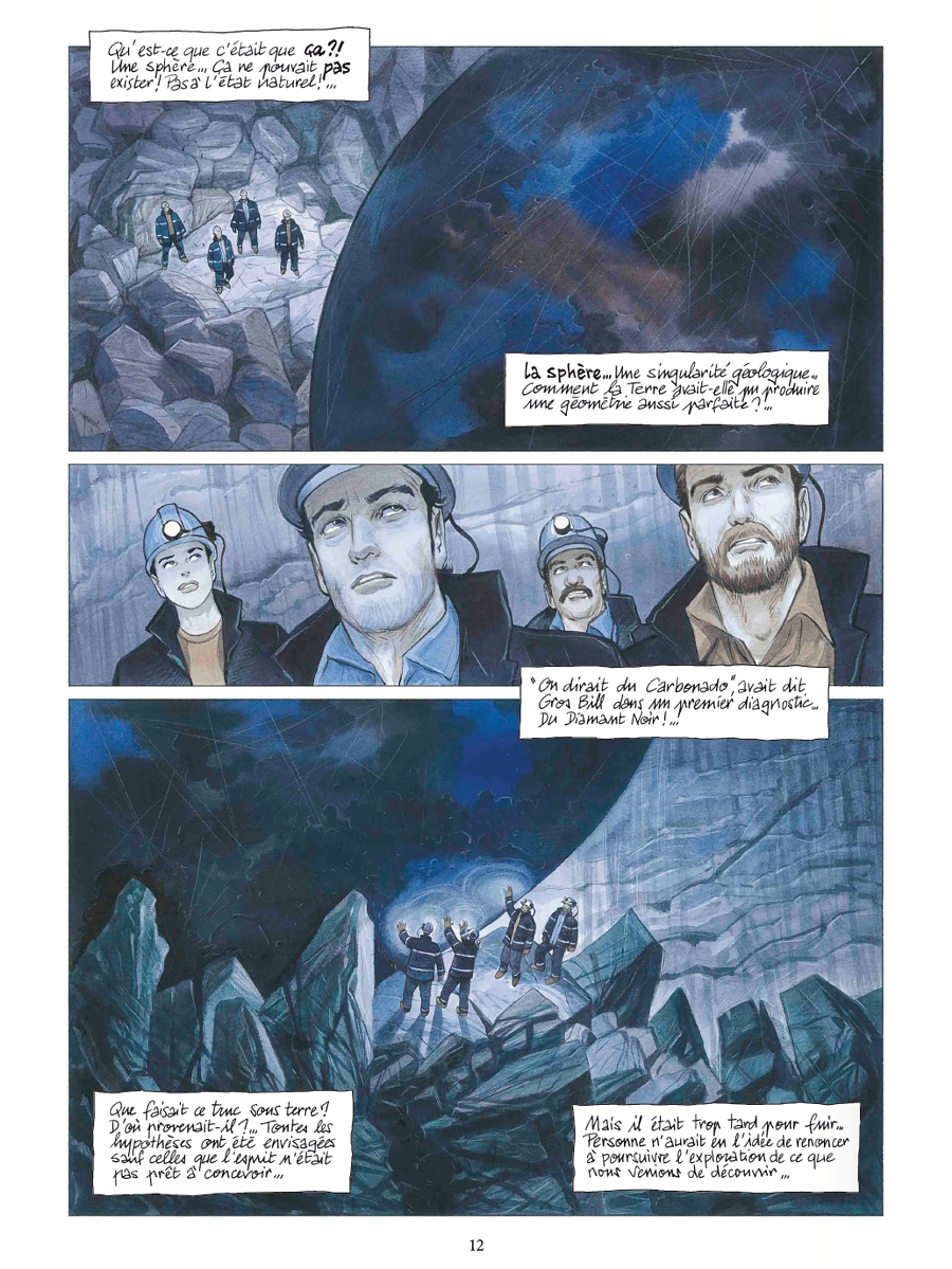 Résumé de l’éditeur : Mine de diamant de « La grande Ourse ». Fin d’été. Une secousse fait trembler la terre, suivie d’un effondrement de terrain dans un secteur proche de l’exploitation. Roy Koks, le responsable de la prospection et la géologue Natane se précipitent pour examiner la nature des dégâts. Une grande partie de la colline s’est effondrée dans un glissement de terrain sans doute dû aux pluies incessantes qui se sont abattues sur la région depuis des semaines. En recherchant les causes de l’accident, les prospecteurs vont découvrir une faille qui donne accès à une cavité souterraine. Au centre de cette cavité, un gigantesque bloc de rocher parfaitement sphérique…