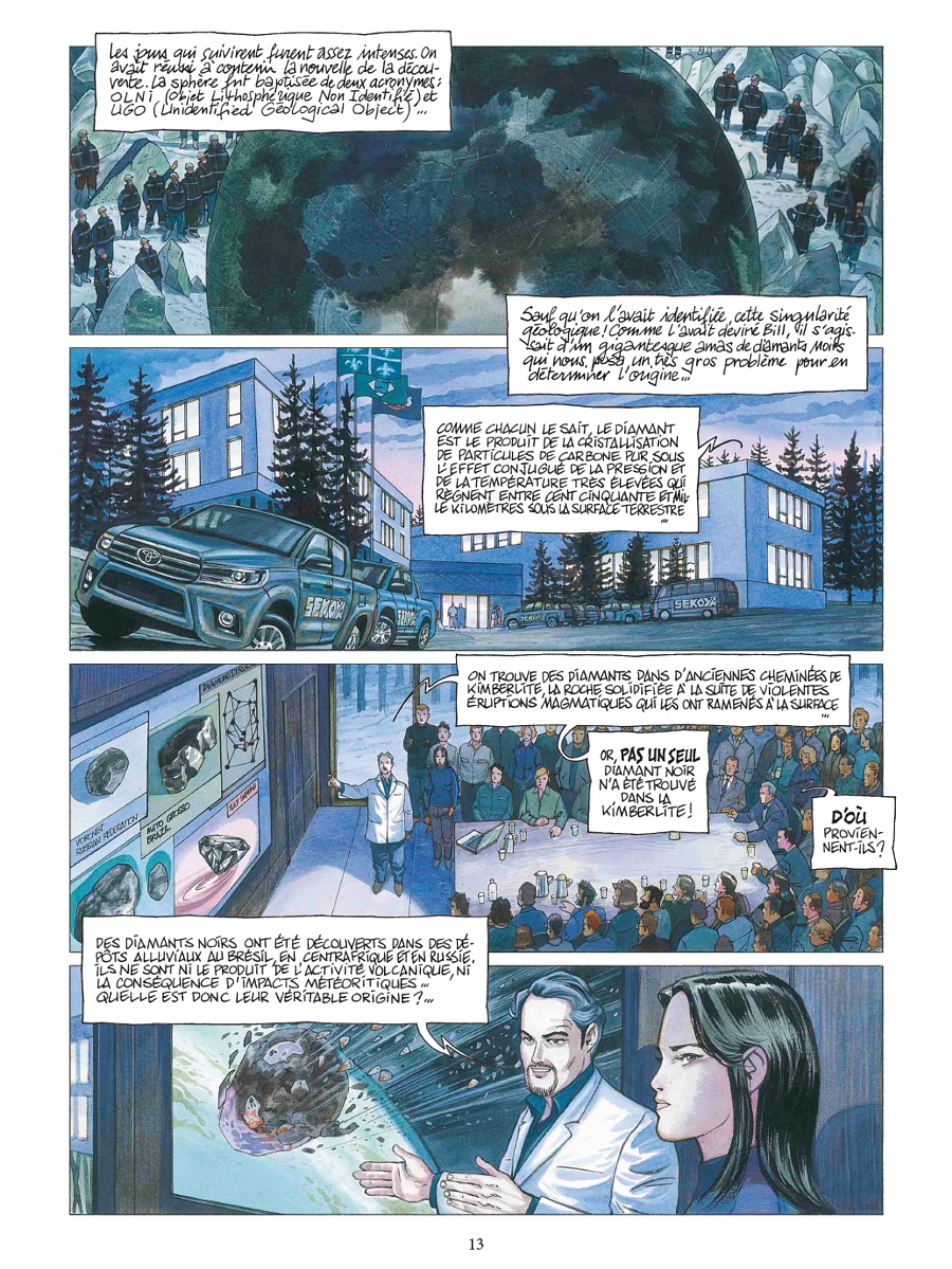 L’exploration de la sphère révèle qu’il n’y a pas une mais deux sphères. La première entoure la seconde. Un liquide qui ressemble à de l’eau les sépare. Natane, géomètre-géologue et fille du chef de la communauté des Cris, découvre de nombreux hiéroglyphes dessinés sur les parois des grottes aux alentours. D’où peuvent-ils venir ? Sont-ils en lien avec la sphère ?