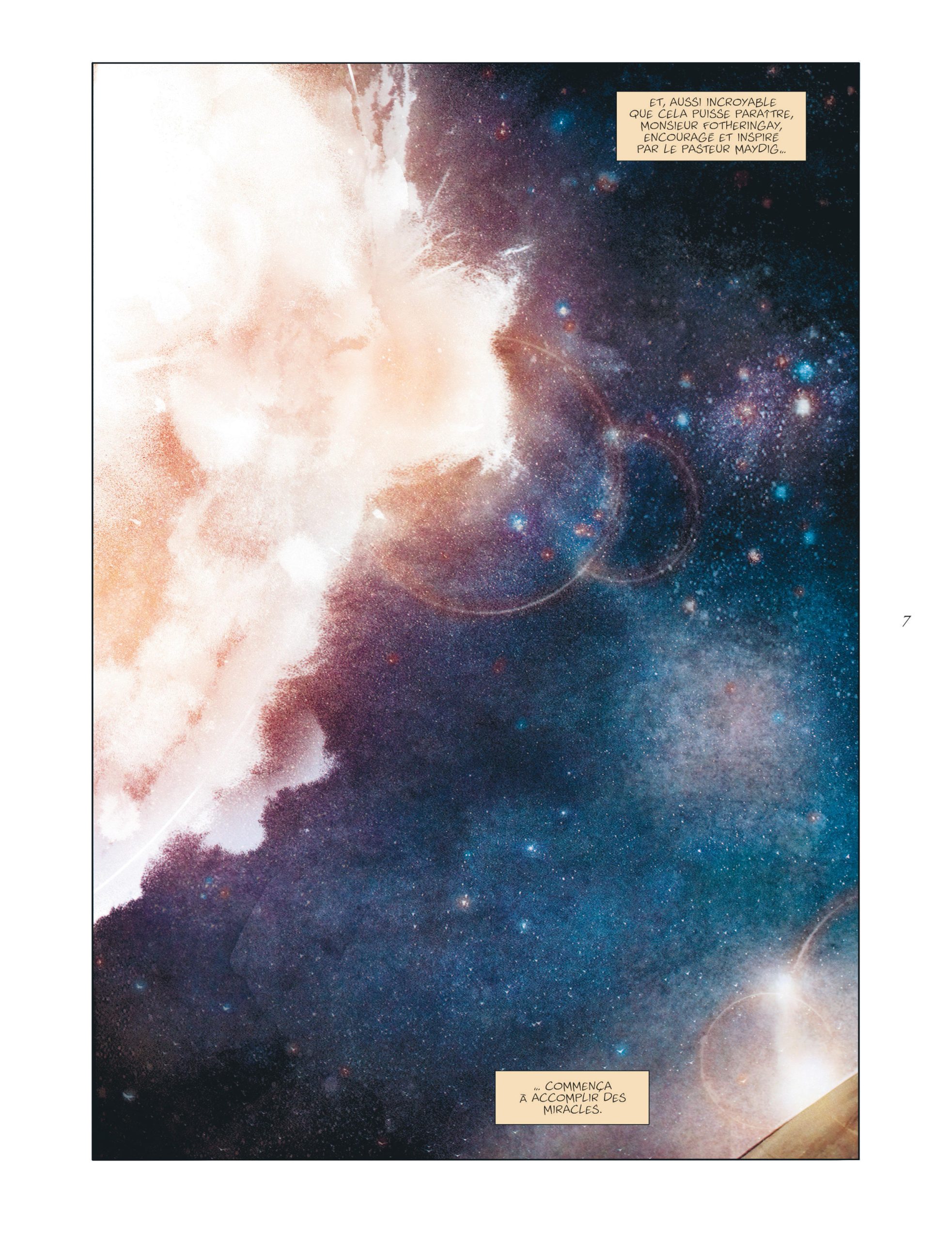 Résumé de l’éditeur : M. Fotheringay, homme ordinaire sans ambition ni imagination, découvre un jour qu’il peut accomplir des miracles d’un simple souhait. Mais plutôt que de changer le monde, il se contente de petits prodiges insignifiants… jusqu’à ce qu’un accès de colère l’amène à envoyer un policier en enfer – littéralement. Pris de panique, il se tourne vers le pasteur Maydig, un homme bien plus enthousiasmé que lui par ce pouvoir. Ensemble, ils entreprennent d’améliorer la société, mais leur maladresse et leur excès de zèle finissent par provoquer une catastrophe aux proportions bibliques ! Seul dans un monde ravagé par ses propres miracles, Fotheringay devra faire face aux conséquences de son incroyable don. Adaptée d’une nouvelle méconnue de H.G. Wells, cette comédie fantastique délicieusement british, entre satire et farce absurde, s’inscrit dans la lignée des oeuvres de Lewis Carroll, Douglas Adams et Terry Pratchett. Une relecture brillante signée J.-L. Munuera, entre Uderzo et Doctor Who, qui nous entraîne dans une aventure aussi burlesque que vertigineuse.