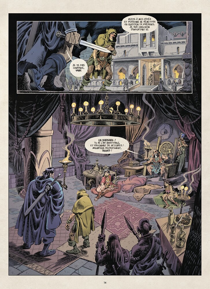 Ainsi, le héros est un colosse invincible qui affronte des ennemis toujours plus puissants, ce qui sera occasion de faire preuve de ses talents guerriers. Néanmoins, et c’est ce qui fait le sel de cette histoire, nous ne sommes pas à l’abri de retournements de situation. Parfaitement maîtrisés, ils vont permettre au héros de montrer que derrière ses muscles, se cache un cerveau, même s’il est vrai que souvent, il en usera pour déterminer si le coup fatal doit être asséné de taille ou d’estoc. Ainsi, les amateurs du genre seront absolument comblés, et ce d’autant plus que le scénario évoque les meilleures parties de jeu de rôle, où combats alternent avec des faux-semblants aussi inattendus qu’espérés. Oscar Martin apparaît alors comme un maître du jeu expérimenté. Et au moyen de cartouches parcheminés, il décrit, commente et même explicite les pensées de son taciturne héros.
