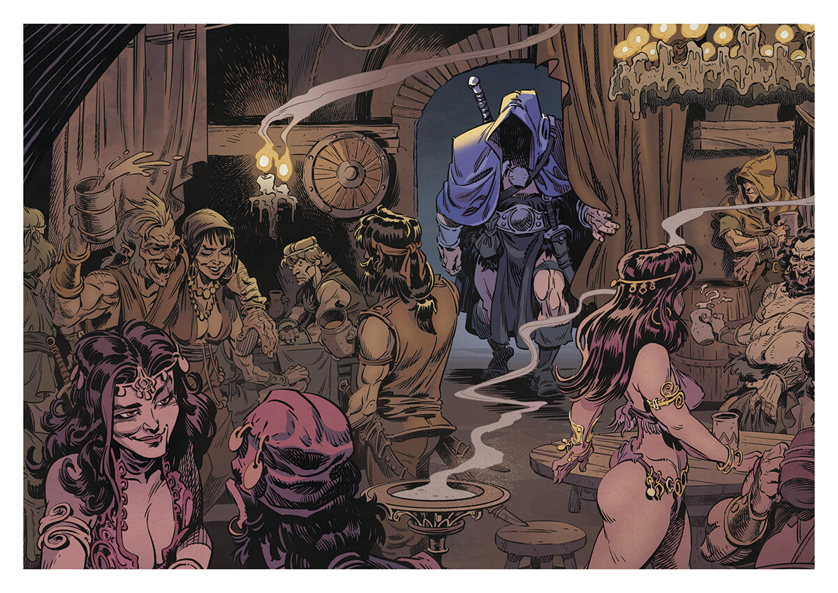 Hud-Hund Engaun. Peu de voyageurs osent s’aventurer dans la sombre cité où les voleurs pullulent. Celui qui tient à sa bourse sait qu’il sera bien inspiré en évitant d’y pénétrer. Et les gibets qui ornent son entrée devraient d’ailleurs suffire à dissuader les plus téméraires. Pourtant, ce soir-là, une ombre colossale se dresse face aux murailles terrifiantes. Son sac est plein de pièces récupérées sur les cadavres de voleurs présomptueux. Alors, là où d’aucuns voient la mort et la désolation, lui, il voit l’occasion d’accumuler davantage de richesses. Il en faudra bien plus pour impressionner le barbare Cimmérien.