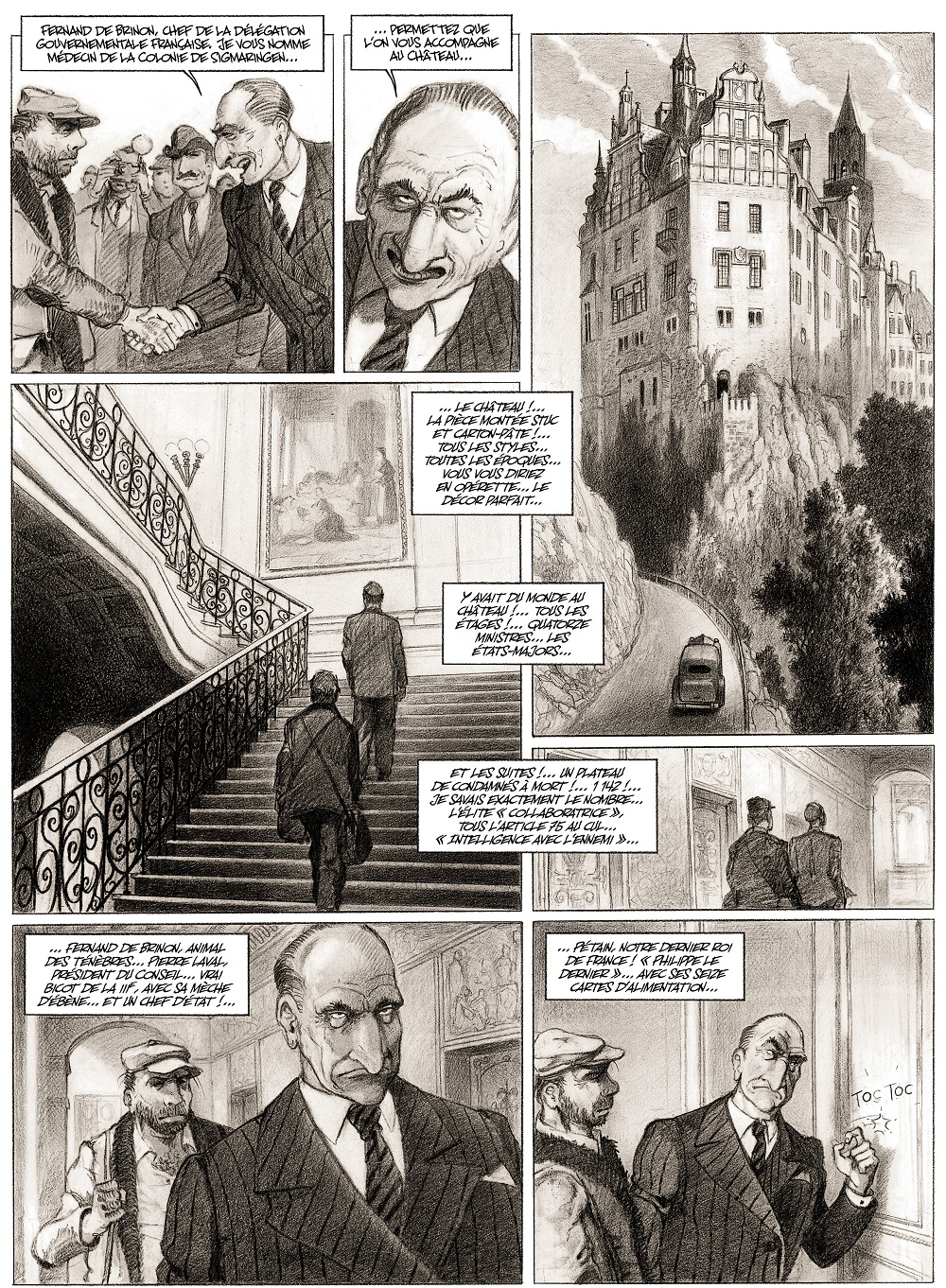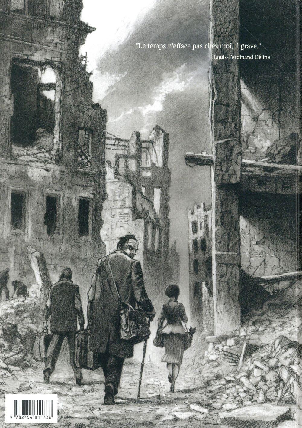Résumé de l’éditeur : 1944 : Louis-Ferdinand Céline, Lucette son épouse et le chat Bébert quittent Paris bombardé. Traversant l’Allemagne en ruines, ils rejoignent Sigmaringen où s’est réfugiée la communauté française collaborationniste, et où ils retrouvent le comédien Robert Le Vigan qui a quitté le tournage des Enfants du paradis. Cerné par des personnages piteux et minables, voire carnavalesques, le drame tourne à la fable burlesque. De cet épisode historique réel, Céline a écrit D’un château l’autre, Nord et Rigodon. Christophe Malavoy, comédien intuitif et liseur attentif de littérature, féru de l’écriture célinienne, a eu l’envie et l’audace d’adapter la trilogie allemande de l’auteur de Voyage au bout de la nuit avec la complicité des frères Brizzi, ténors du film d’animation français.