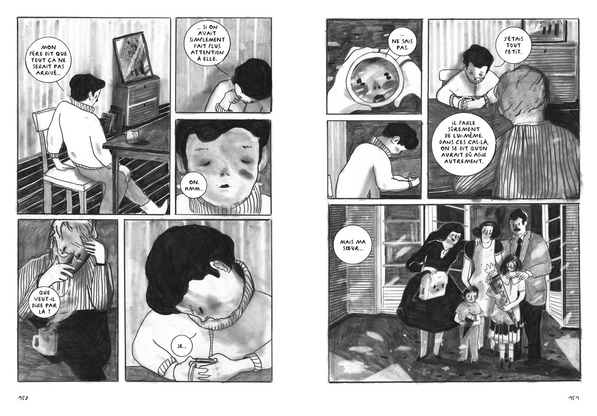 Résumé de l’éditeur : Paul a perdu sa mère il y a quelques années. Sa disparition demeure mystérieuse et ne cesse de hanter le jeune garçon. Aussi s’efforce-t-il de rassembler les indices qui pourraient lui permettre de trouver une explication. Entre ses propres souvenirs, brumeux et lacunaires, la version de sa grande soeur perpétuellement distante, la conviction de son père, les silences, les tabous, et la découverte de photos et lettres de sa mère, Paul va retracer le fil de son histoire personnelle, nous livrant son interprétation des événements passés. Car si certaines familles célèbrent leur histoire avec un arbre généalogique et d’innombrables albums photos, d’autres couvent un secret autour duquel les vérités divergent et s’entrechoquent. Dans ce premier roman graphique, Antonia Kühn rend compte avec sensibilité des émotions de chacun et questionne avec justesse ce qui détermine et façonne l’histoire des individus, ce qui unit ou pas les membres d’une famille les uns aux autres.